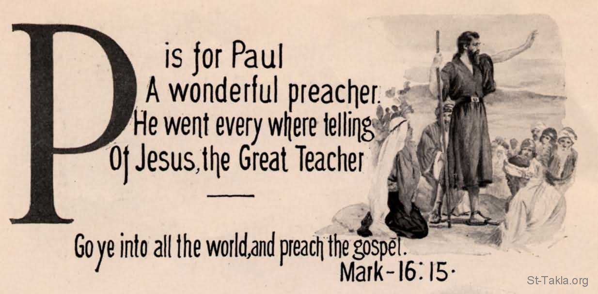 بولس الكاروز الرائع, الذي جال في كل مكان يخبر بالمسيح المعلم الأعظم: "اذهبوا إلى العالم أجمع واكرزوا بالإنجيل للخليقة كلها" (مرقس 16: 15) - من صور الإنجيل من شركة بروفيدينس المطبوعة حجريًا.