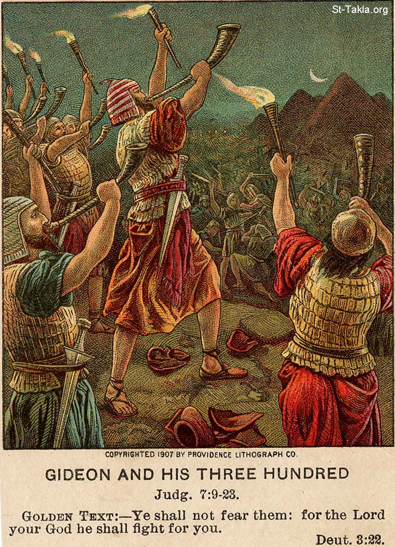 جدعون ورفاقه الثلاثة مئة (قضاة 7: 9-23): "لا تخافوا منهم، لأن الرب إلهكم هو المحارب عنكم" (التثنية 3: 22) - من صور الإنجيل من شركة بروفيدينس المطبوعة حجريًا.