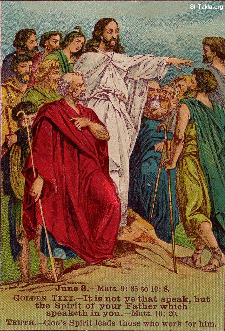 (متى 9: 35 إلى متى 10: 8): "لأن لستم أنتم المتكلمين بل روح أبيكم الذي يتكلم فيكم" (متى 10: 20) - روح الرب تقود الذين يعملون معه. - من صور الإنجيل من شركة بروفيدينس المطبوعة حجريًا.