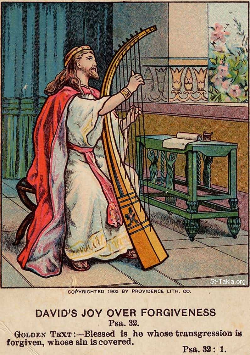 فرح داود بالمغفرة: "طوبى للذي غفر إثمه وسترت خطيته" (مزمور 32: 1) - من صور الإنجيل من شركة بروفيدينس المطبوعة حجريًا.