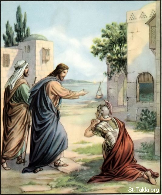 قائد المائة يرجو السيد يسوع المسيح من أجل عبده (متى 8: 5-10؛ لوقا 7: 2-10) - من كتاب "قراء قصص الكتاب المقدس الأساسية"، الكتاب السادس، ليلي أ. فارس.