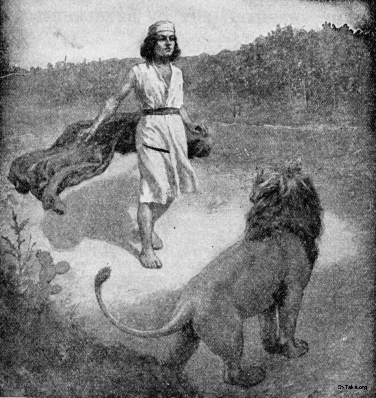 الصبي داود يقابل الأسد - من كتاب "قصة الكتاب المقدس"، إصدار الكاهن هيرلبات، 1904.
