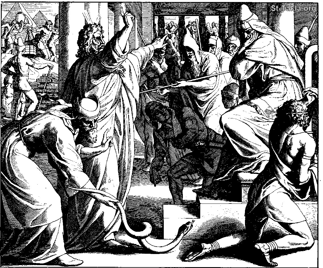 Moses' Staff Becomes a Snake - Aaron's Rod Changed to a Serpent (Exodus 7:10) - from "The Book of Books in Pictures", Julius Schnorr von Carolsfeld, Verlag von Georg Wigand, Liepzig: 1908.