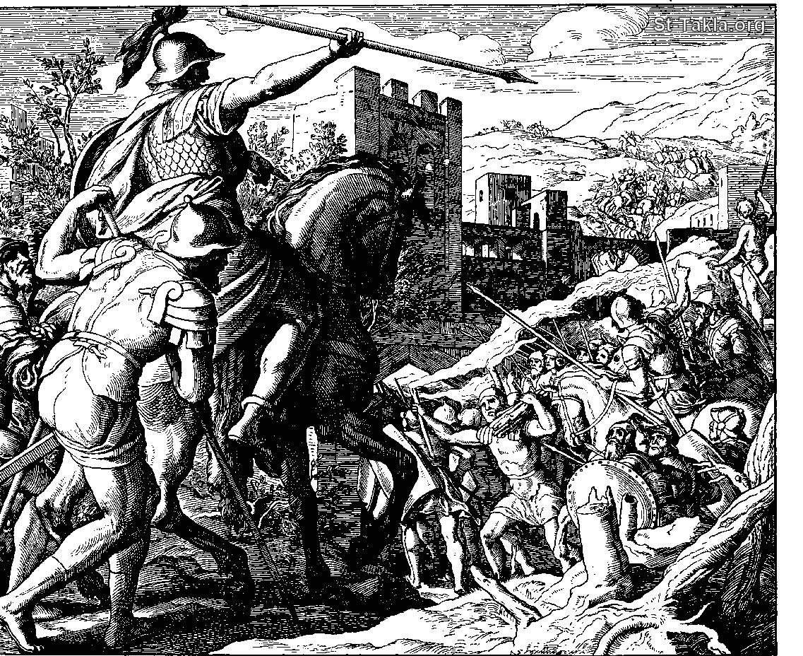 Joshua at Ai - Joshua Capturing the City of Ai (Joshua 8:18-19) - from "The Book of Books in Pictures", Julius Schnorr von Carolsfeld, Verlag von Georg Wigand, Liepzig: 1908.
