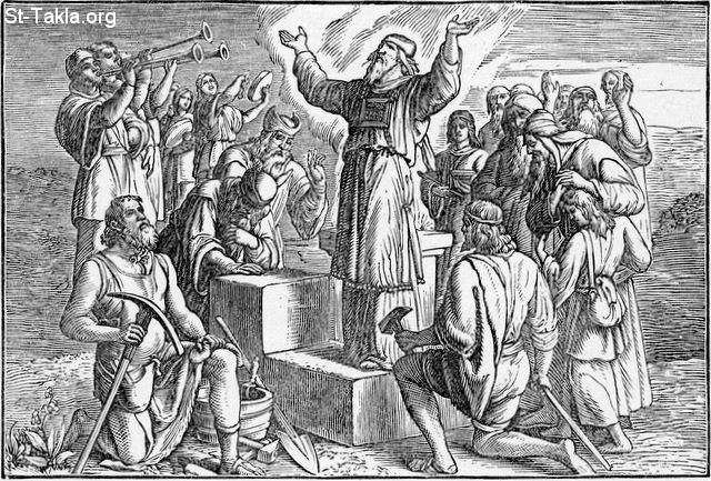 Rebuilding the Temple - Building the new temple (Ezra 3:10) - from "The Book of Books in Pictures", Julius Schnorr von Carolsfeld, Verlag von Georg Wigand, Liepzig: 1908..