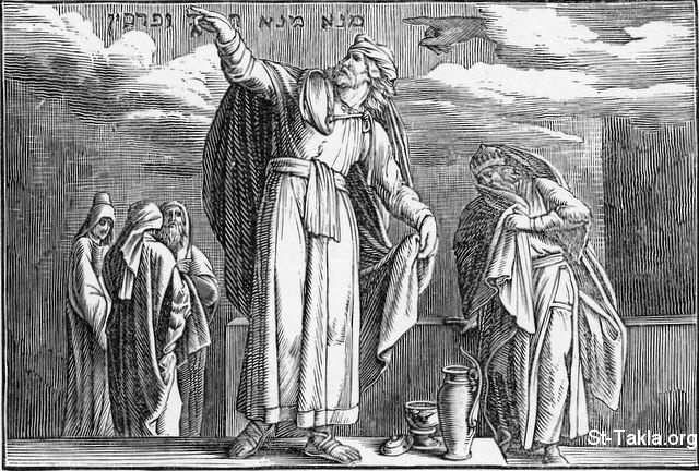 دانيال النبي يفسر الكتابة على الحائط (دانيال 5: 25-28) - من كتاب "كتاب الكتب بالصور"، جوليوس شنور فون كارولسفيلد، فيرلاج فون جورج ويجاند، ليبزيج، 1908 م.