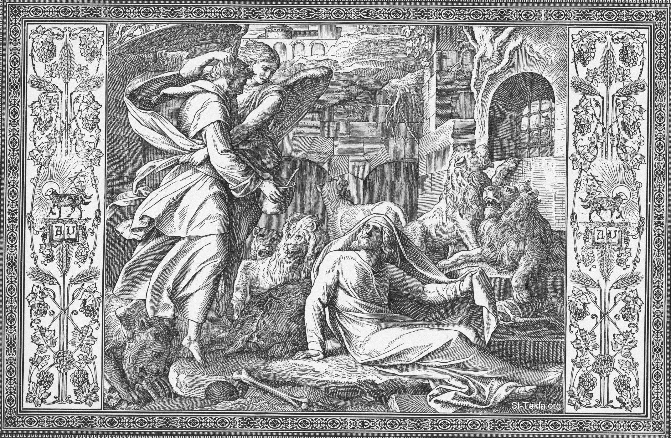 الملاك يحضر حبقوق النبي لدانيال في بابل في جب الأسود (تتمة دانيال 14: 35) - من كتاب "كتاب الكتب بالصور"، جوليوس شنور فون كارولسفيلد، فيرلاج فون جورج ويجاند، ليبزيج، 1908 م.