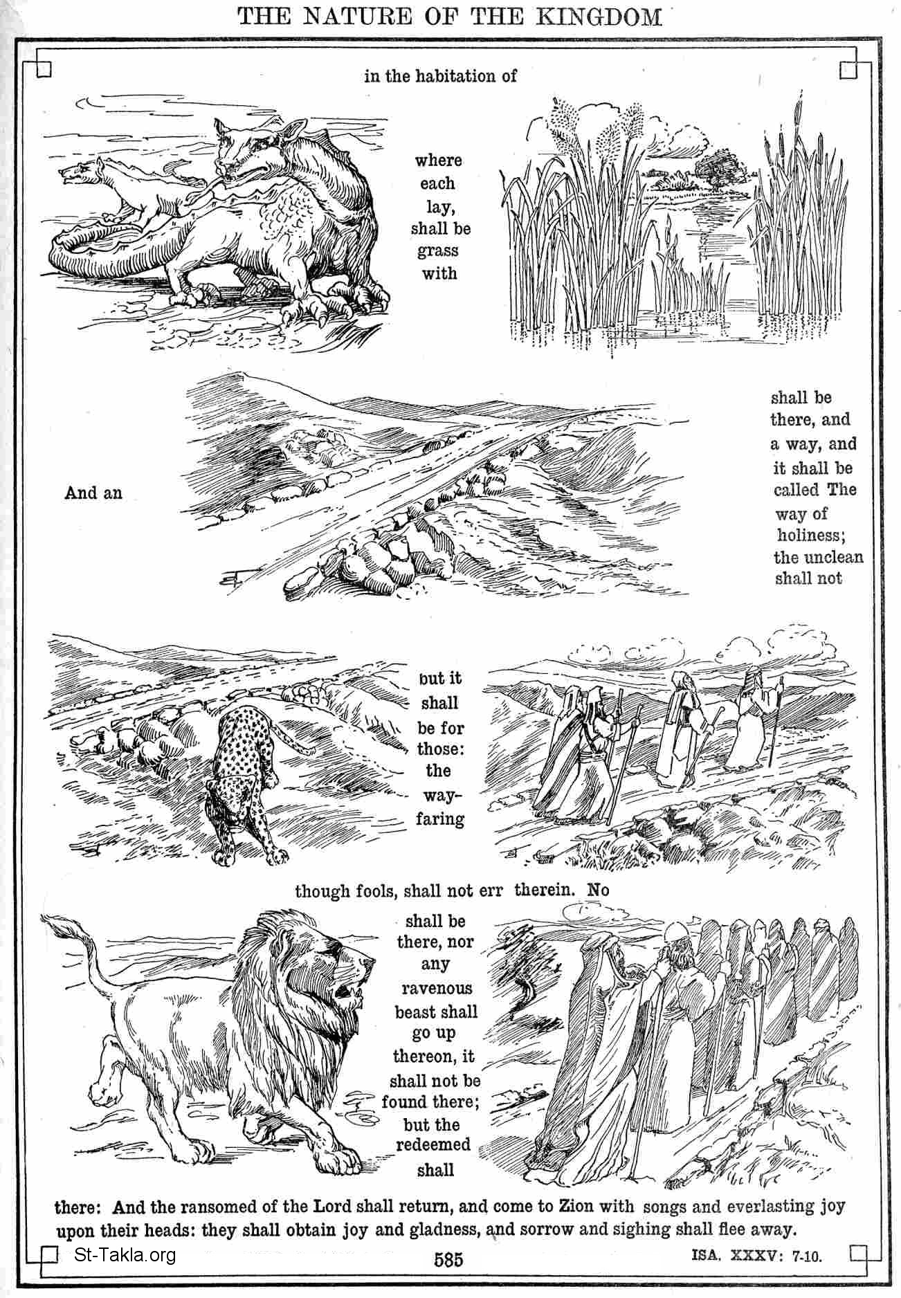 لا يكون هناك أسد. وحش مفترس لا يصعد إليها. لا يوجد هناك. بل يسلك المفديون فيها ومفديو الرب يرجعون ويأتون إلى صهيون بترنم، وفرح أبدي على رؤوسهم. ابتهاج وفرح يدركانهم. ويهرب الحزن والتنهد". - (أشعياء 35: 7- 10) - صور العهد القديم - كتاب الإنجيل في صور (رموز الإنجيل الجديدة)، 1922، لـ م. بين و جي. بيلينجز.