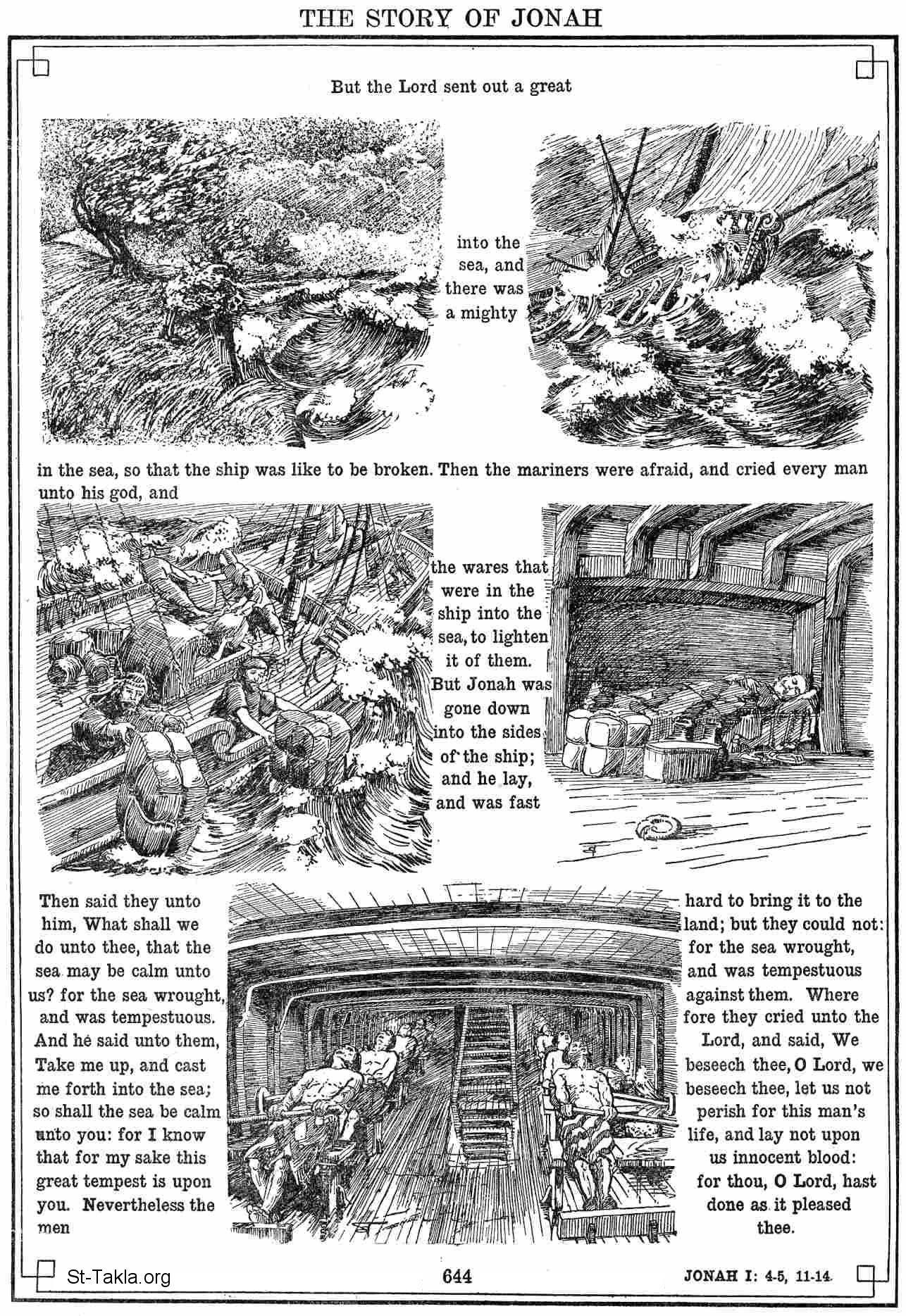 فصرخوا إلى الرب وقالوا: آه يارب، لا نهلك من أجل نفس هذا الرجل ، ولا تجعل علينا دما بريئا، لأنك يارب فعلت كما شئت ". - (يونان 1: 4-5، 11- 14) - صور العهد القديم - كتاب الإنجيل في صور (رموز الإنجيل الجديدة)، 1922، لـ م. بين و جي. بيلينجز.