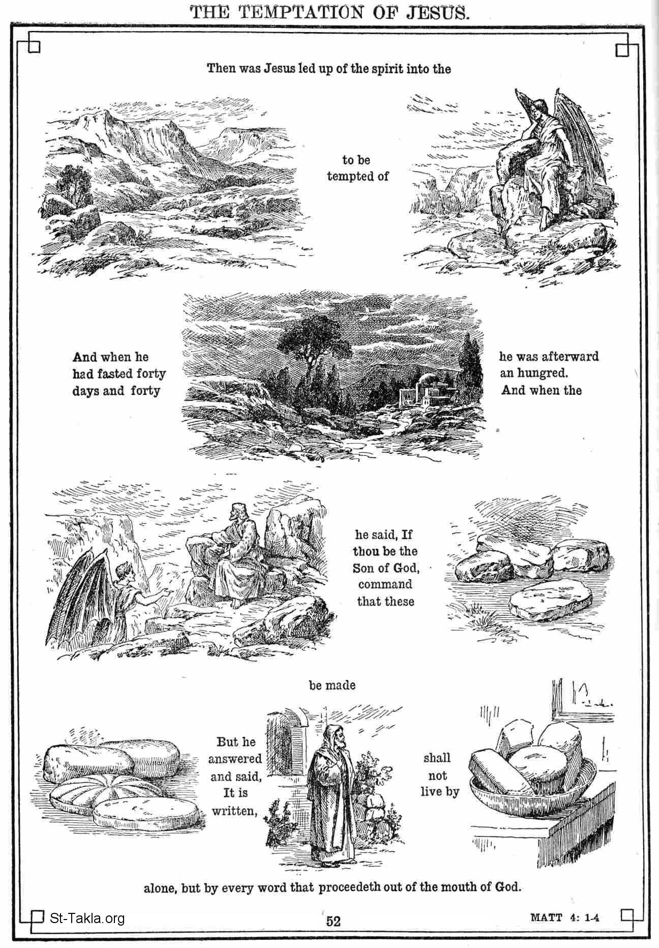 فأجاب وقال: مكتوب : ليس بالخبز وحده يحيا الإنسان، بل بكل كلمة تخرج من فم الله ". - (متى 4: 1-4) - صور العهد الجديد - كتاب الإنجيل في صور (رموز الإنجيل الجديدة)، 1922، لـ م. بين و جي. بيلينجز.
