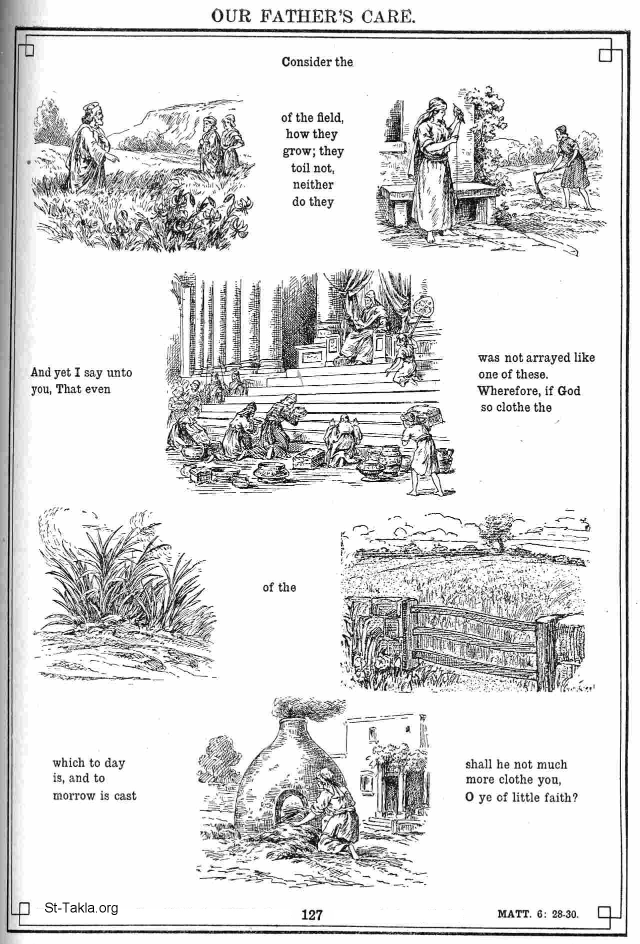 فإن كان عشب الحقل الذي يوجد اليوم ويطرح غدا في التنور، يلبسه الله هكذا، أفليس بالحري جدا يلبسكم أنتم يا قليلي الإيمان ". - (متى 6: 28-30) - صور العهد الجديد - كتاب الإنجيل في صور (رموز الإنجيل الجديدة)، 1922، لـ م. بين و جي. بيلينجز.
