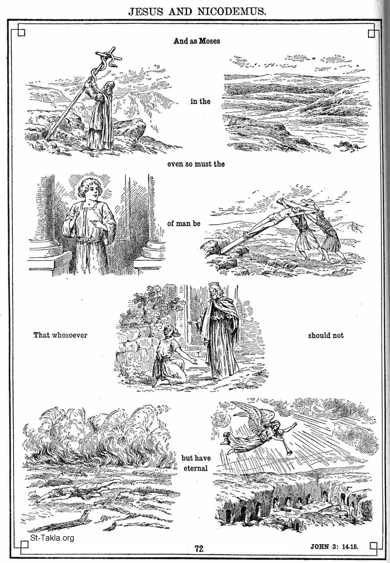 لكي لا يهلك كل من يؤمن به بل تكون له الحياة الأبدية". - (يوحنا 3: 14- 15) - صور العهد الجديد - كتاب الإنجيل في صور (رموز الإنجيل الجديدة)، 1922، لـ م. بين و جي. بيلينجز.
