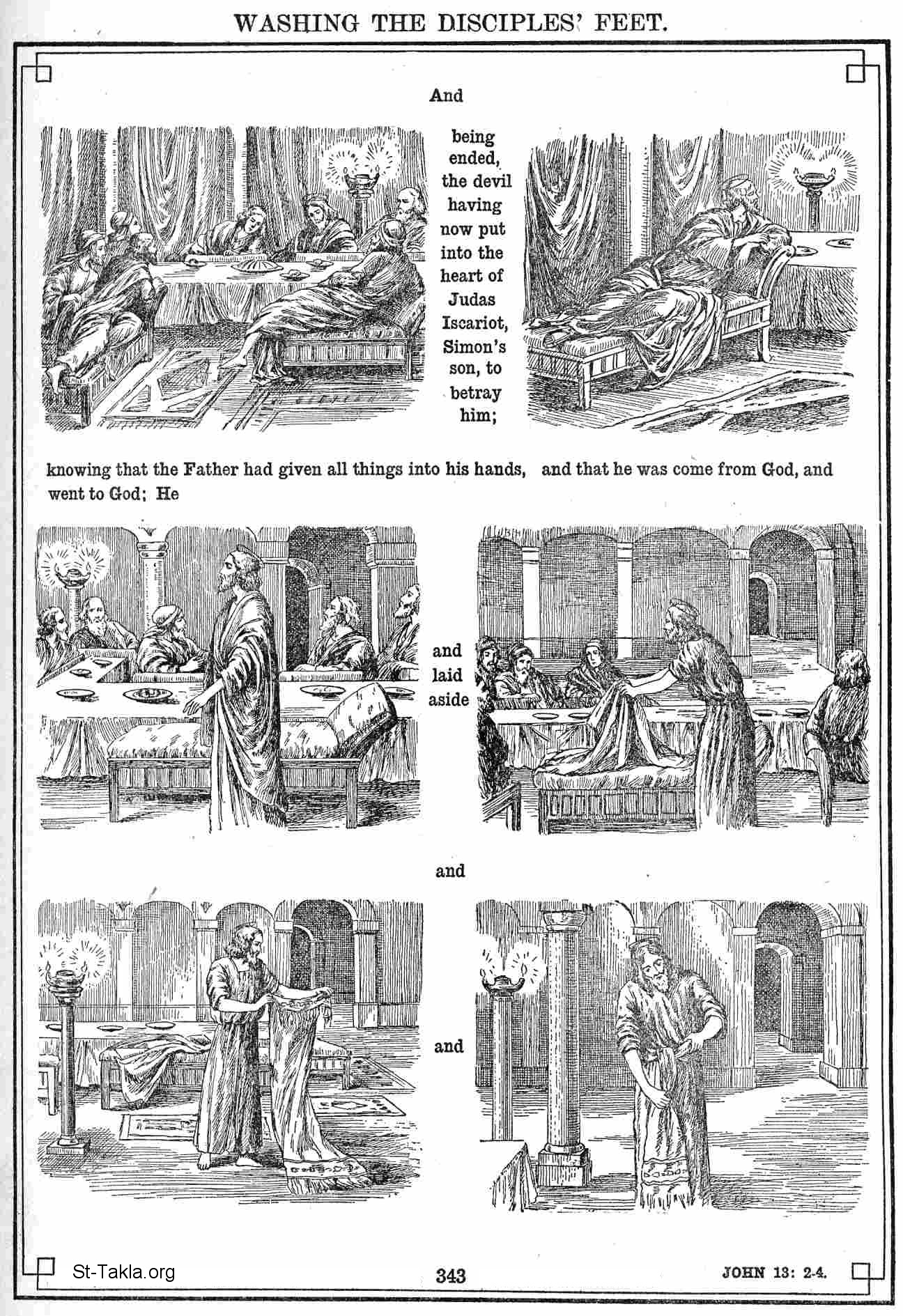قام عن العشاء، وخلع ثيابه، وأخذ منشفة واتزر بها ". - (يوحنا 13: 2-4) - صور العهد الجديد - كتاب الإنجيل في صور (رموز الإنجيل الجديدة)، 1922، لـ م. بين و جي. بيلينجز.