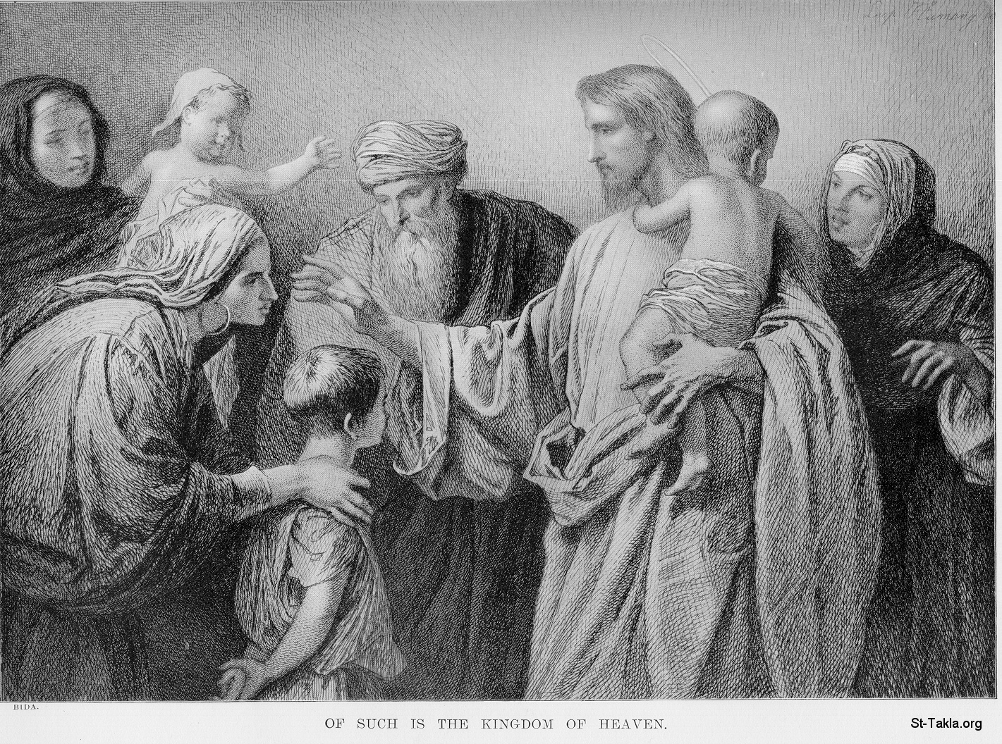المسيح مع الأطفال: "دعوا الأولاد يأتون إلي ولا تمنعوهم لأن لمثل هؤلاء ملكوت السماوات" (متى 19: 14؛ مرقس 10: 14؛ لوقا 18: 16) - من كتاب "إنجيل الشعب".