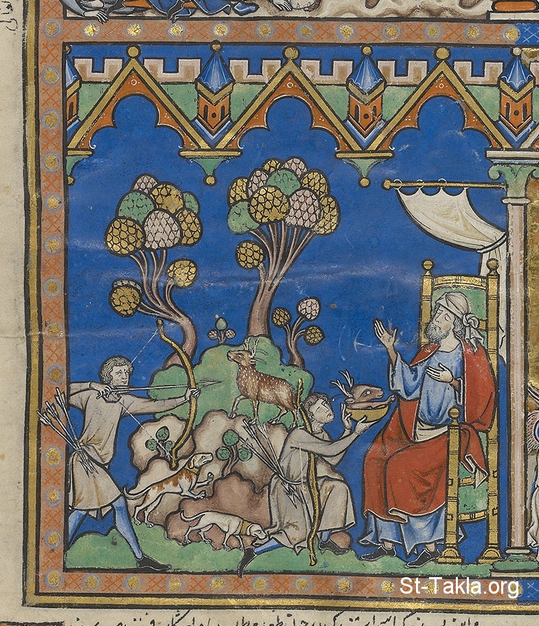 Returning from his hunt, Esau presents his kill to the blind Isaac. Isaac laments, realizing that he has been duped by Jacob and that Esau must ever serve his younger brother. (Genesis 27:30–35)