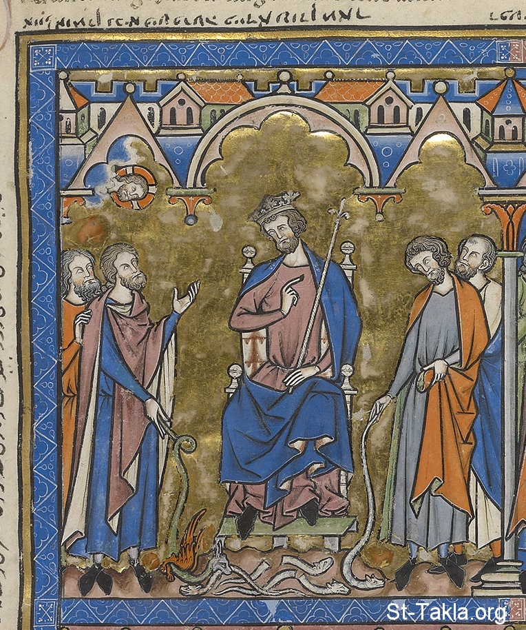 The Lord has sent Moses and his brother Aaron to Pharaoh with demands. As a sign of his power, the Lord has transformed Aaron's staff into a winged serpent, but Pharaoh is unimpressed because his own magicians duplicate the feat. Unnoticed by the Egyptians, Aaron's winged serpent devours those of the magicians, foreshadowing the coming wrath of the Lord. (Exodus 7:10–13)