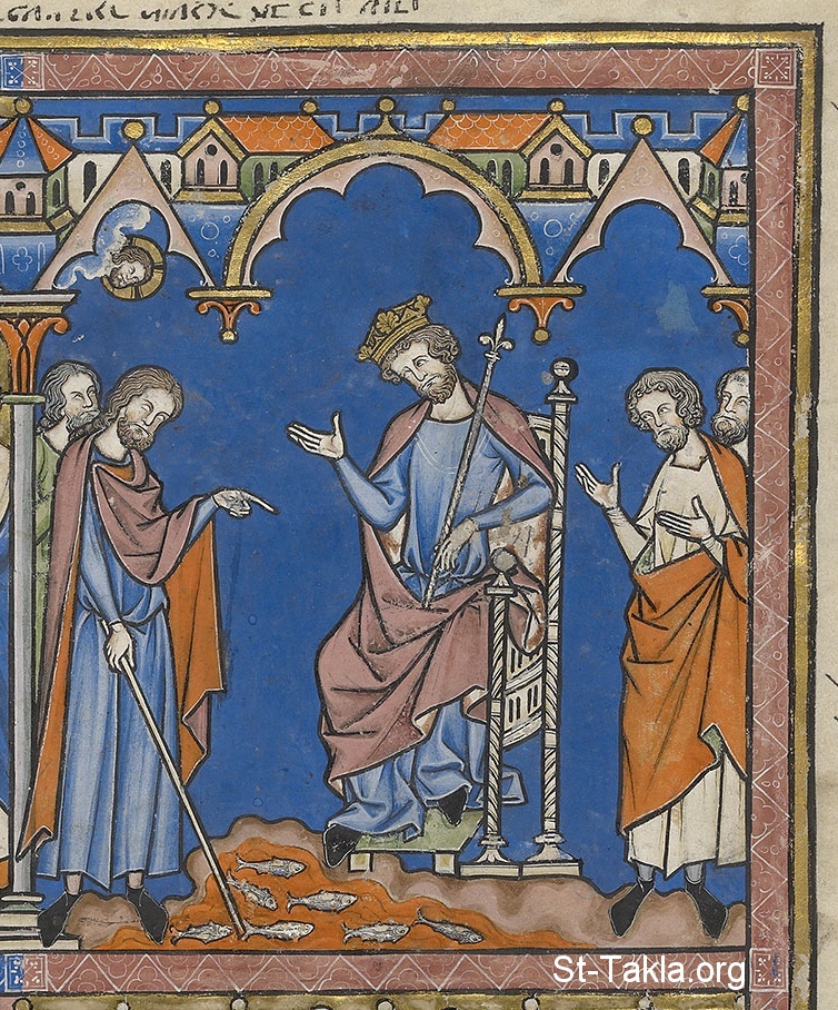 Pharaoh and his sorcerers look on in dismay as Aaron strikes the Nile with his staff, transforming the waters into blood and killing the fish. Pharaoh is still not swayed, however, as his magicians duplicate this feat with false magic. (Exodus 7:20–22)