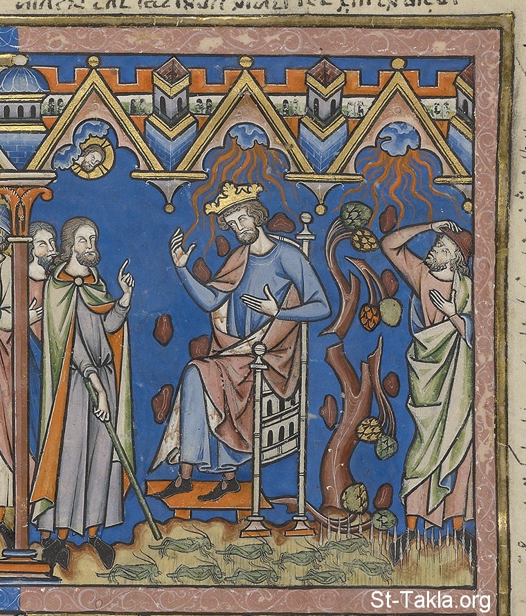 Again the king stubbornly ignores Moses' predictions of the Lord's wrath. Now the whole of Egypt suffers as lightning strikes the earth and hailstones hurtle from the sky, crushing trees, man, and beast. What little plant life is left is consumed by a voracious plague of locusts. Still, Pharaoh refuses to let the Israelites leave. (Exodus 9:23–26, Exodus 10:12–19)