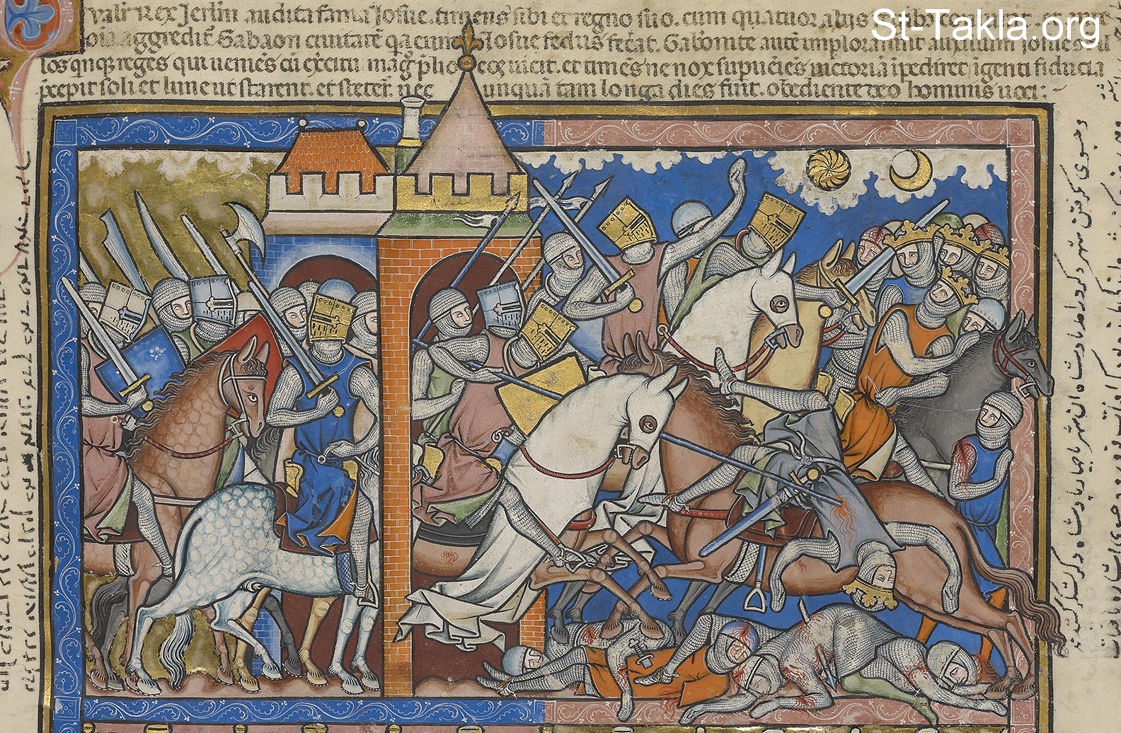 Joshua and his army depart to defend the city of Gibeon, now under siege by the Amorite kings. Joshua is twice shown in this illustration; in the center, he rides through a city gate and spears an enemy king. Behind this group he appears again, imperiously commanding the sun and moon to remain motionless in the sky. As daylight is prolonged, the Israelites have ample time to revenge themselves upon their enemies. To the right, the other Amorite kings flee their attackers. (Joshua 10:6–13)
