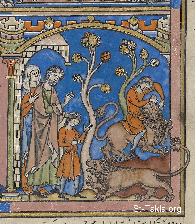 As the Lord promised, Manoah's wife conceives a boy, Samson. When he comes of age, his parents accompany him to Timnah to choose a wife. On the way, the family - Morgan Bible (image 135), medieval illuminated manuscript, 13th century.
