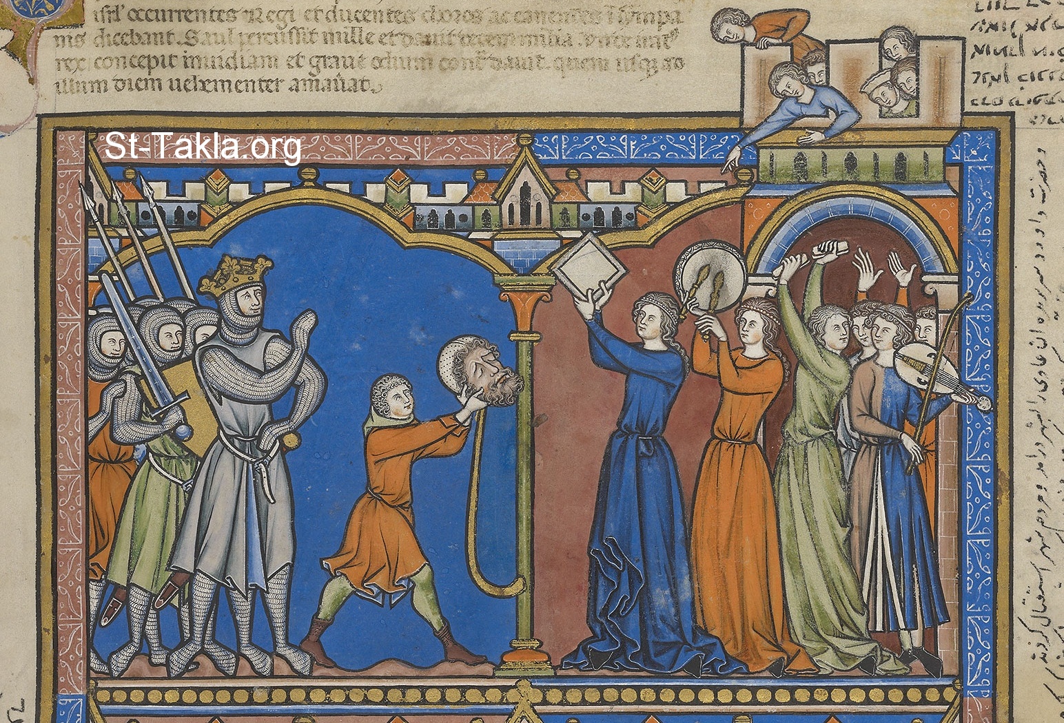 Saul is enraged and envious when the victorious David, bearing the head of Goliath, receives greater praise than he. "Saul slew his thousands," the Israelite women sing, "and David his ten thousands." (1 Kings 18:6–9) - Morgan Bible (image 270), medieval illuminated manuscript, 13th century.