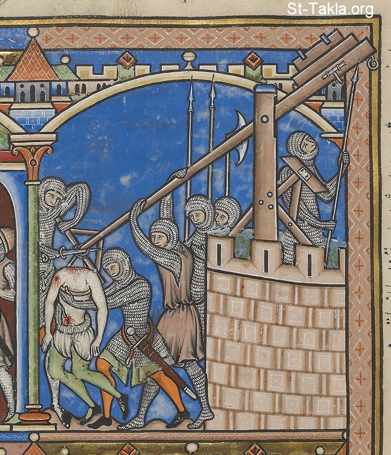 Having learned how the Philistines disgraced the king's corpse, valiant men of Jabesh Gilead journey through the night in secret to retrieve the bodies of Saul and his sons. As one soldier pushes the war engine's counterpoise upwards with his spear, his fellows, wearing mournful expressions, hold down the joist and cut loose the king's body. (1 Kings 31:11–12)