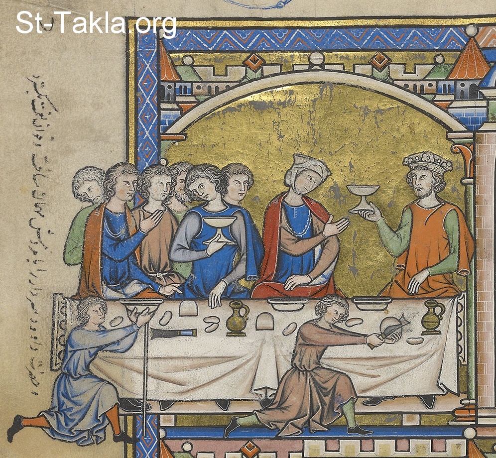 At the king's table in Hebron, Michal accepts a cup from David. To her right, Abner and men of his company celebrate the new alliance with Judah. The suspicious, half-hidden bearded figure in the background wearing a green tunic is probably the vengeful Joab. (2 Kings 3:20–21)