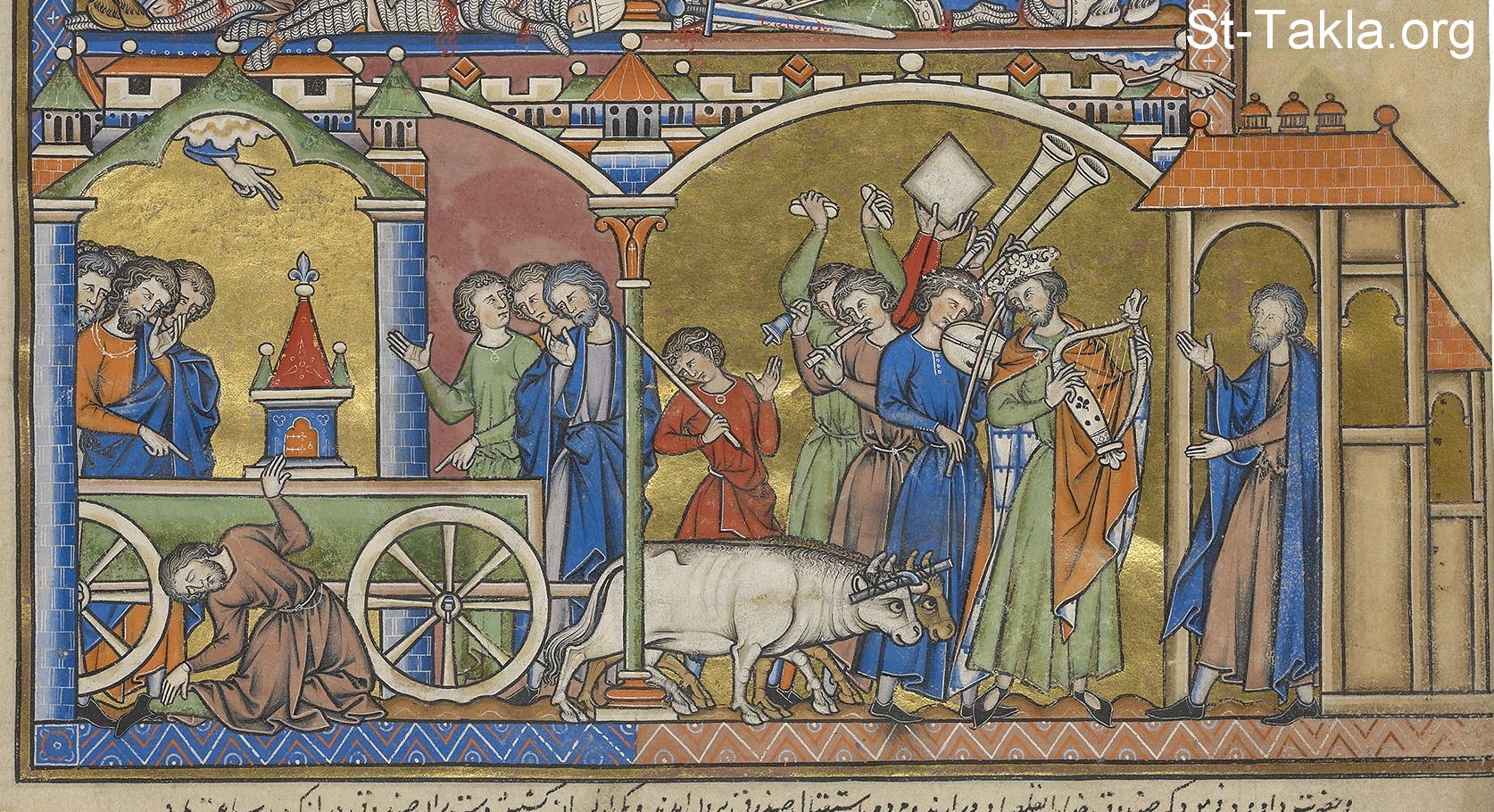 The king seeks to bring the Ark of the Covenant out of the house of Abinadab and into Jerusalem. But as David plays his harp at the head of a joyous procession of musicians, he is stopped suddenly by an awful sight. Uzzah, the son of Abinadab, reaches out to steady the Ark on the bumpy road. For this rashness, the Lord strikes him down where he stands. As the tragedy is pointed out to Uzzah's brother, Ahio, the king casts a concerned glance at the Ark. He decides to enshrine it temporarily in the house of Obed-Edom, who greets David from his doorway at the right. From the heavens, the hand of the Lord blesses Obed-Edom's house. (2 Kings 6:2–11)