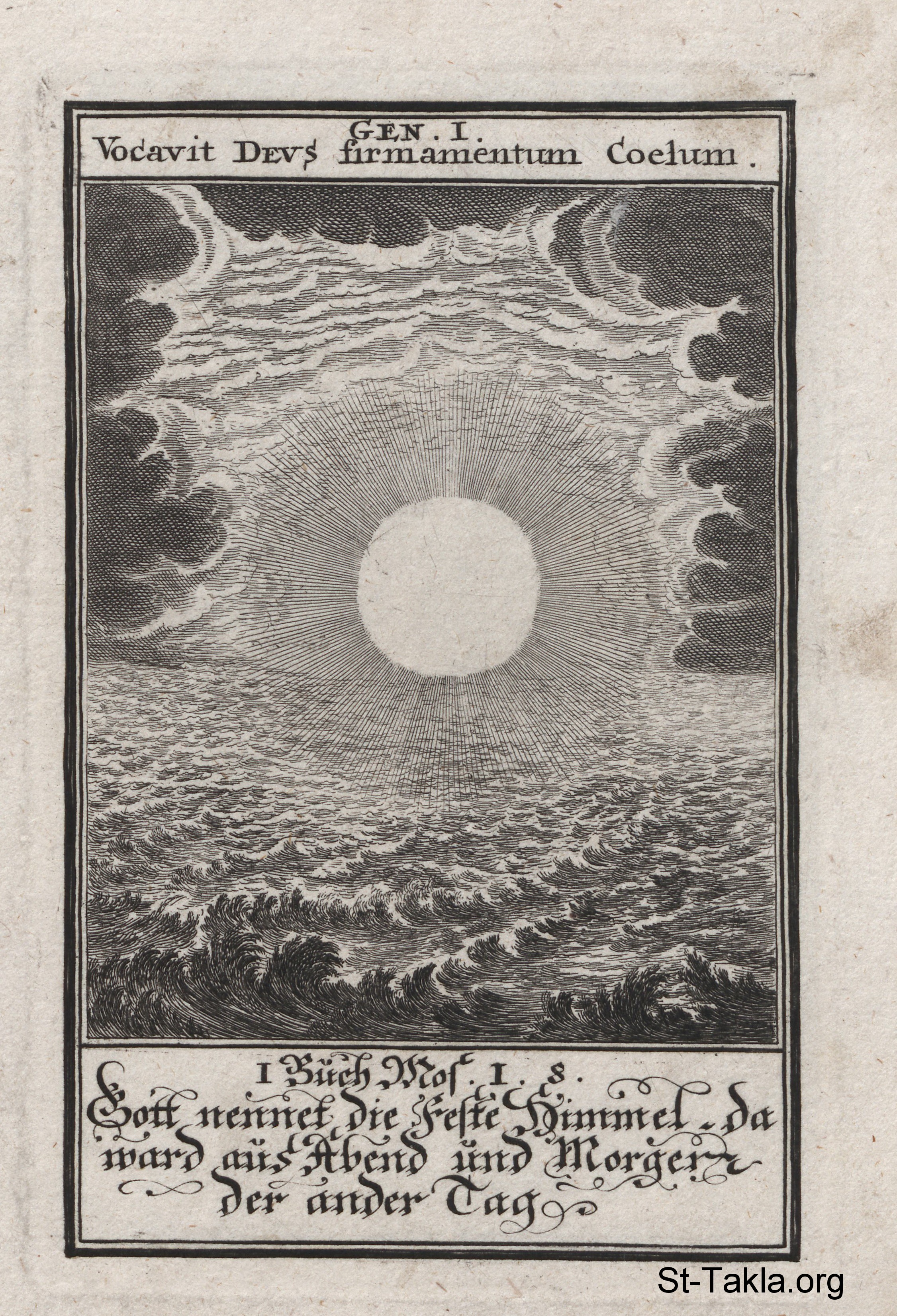 اليوم الثاني للخليقة: الله (الضوء المنير في الوسط) يخلق الجلد للفصل بين مياه السماء وما أسفلها: (التكوين 1: 6-8)، للفنان يوهان أولريخ كراوس (1645-1719)، ومن نقش الفنان كريستوفر إيمارت (1638-1705) - من كتاب: الكتاب المقدس المصور، يوهان كريستوف فيجيل، 1965 م.
