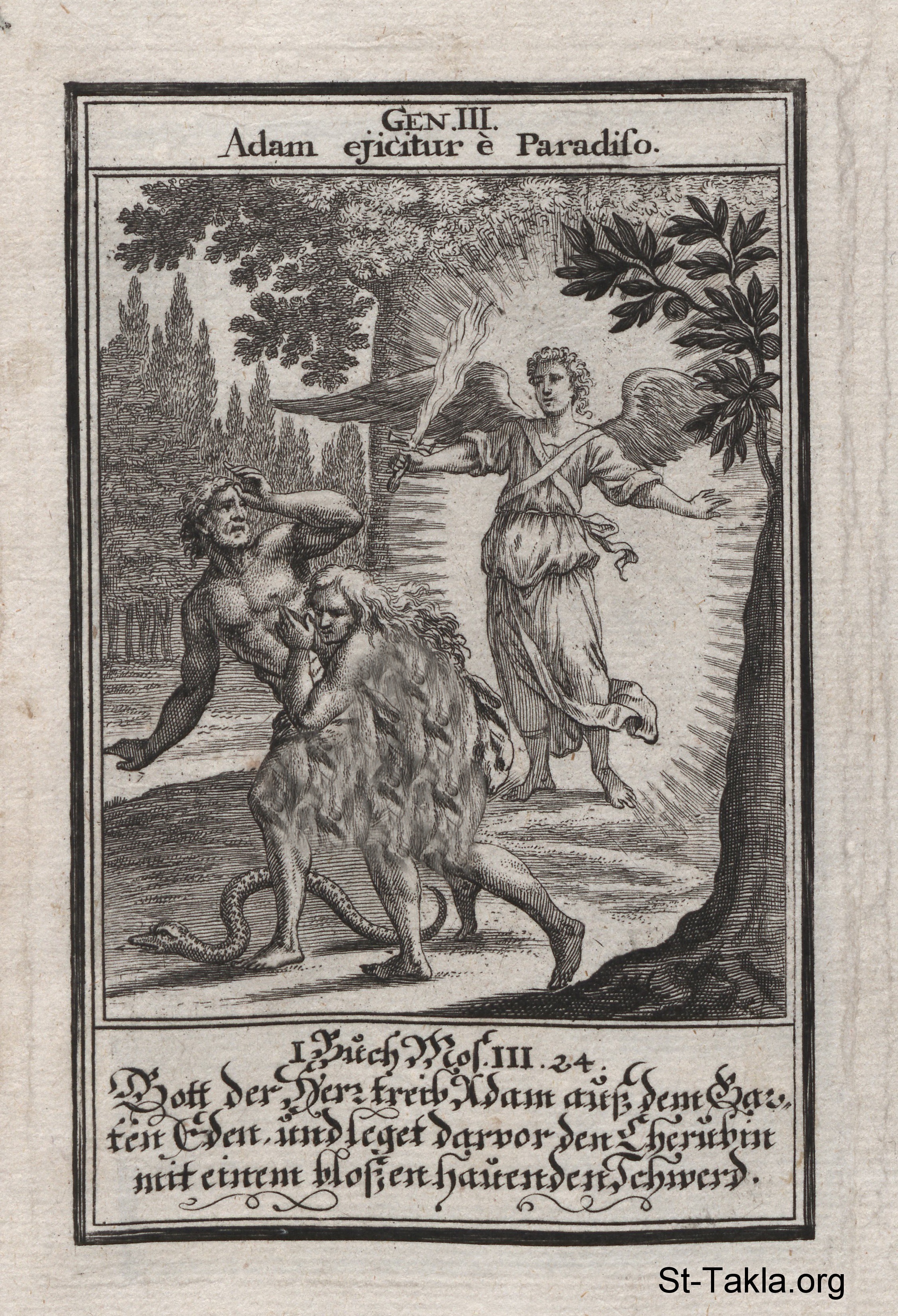 Expulsion: Adam and Eve are expelled from the Garden of Eden by the angel: (Genesis 3) - from the book: Biblia Ectypa (Pictorial Bible), by Johann Christoph Weigel, 1695.