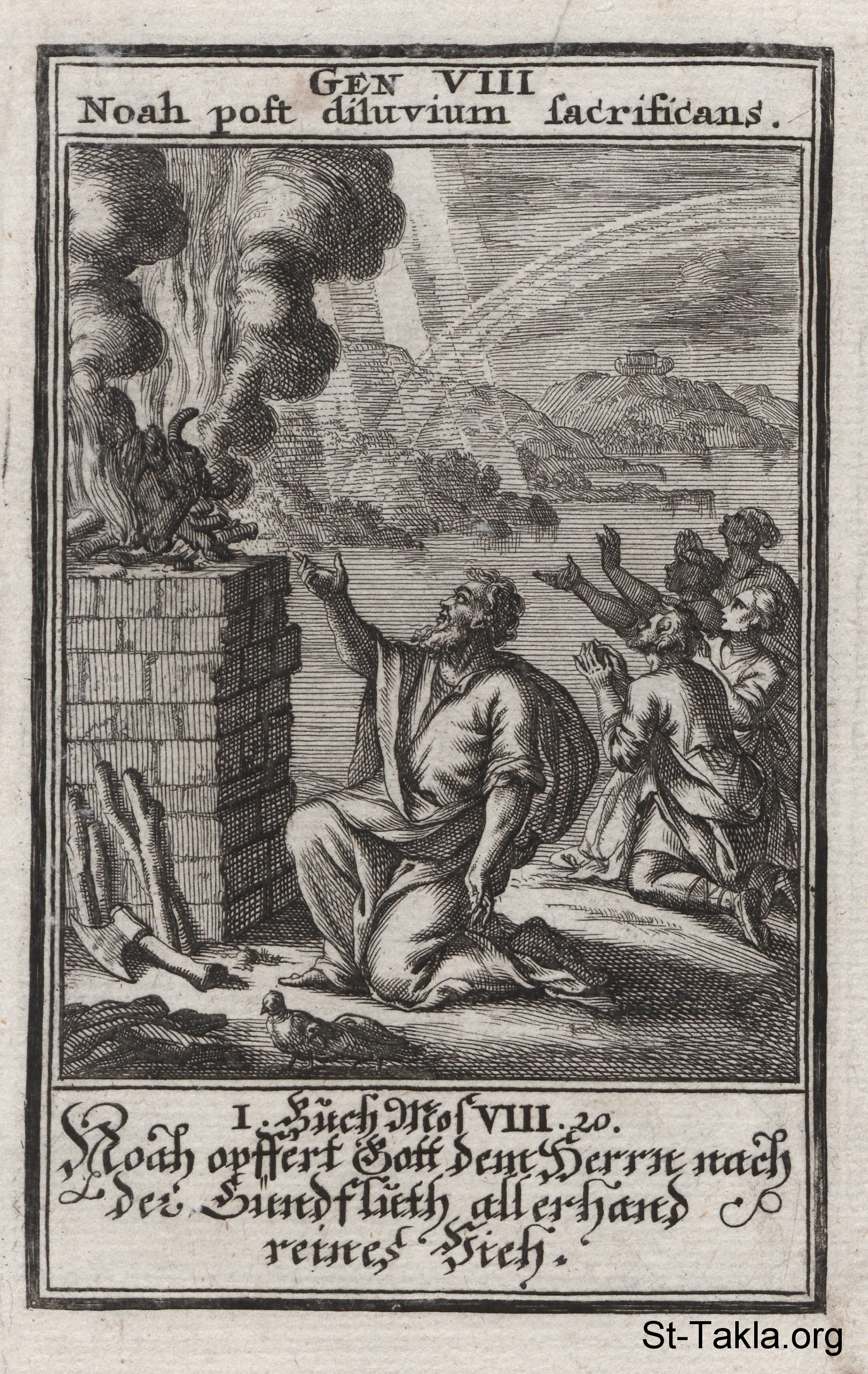 Noah’s Altar and God’s Promise: After the flood Noah offers a sacrifice from all the living things to God. God places a rainbow in the sky as a sign of his pledge to never again destroy the earth by flood: (Genesis 8, 9) - from the book: Biblia Ectypa (Pictorial Bible), by Johann Christoph Weigel, 1695.