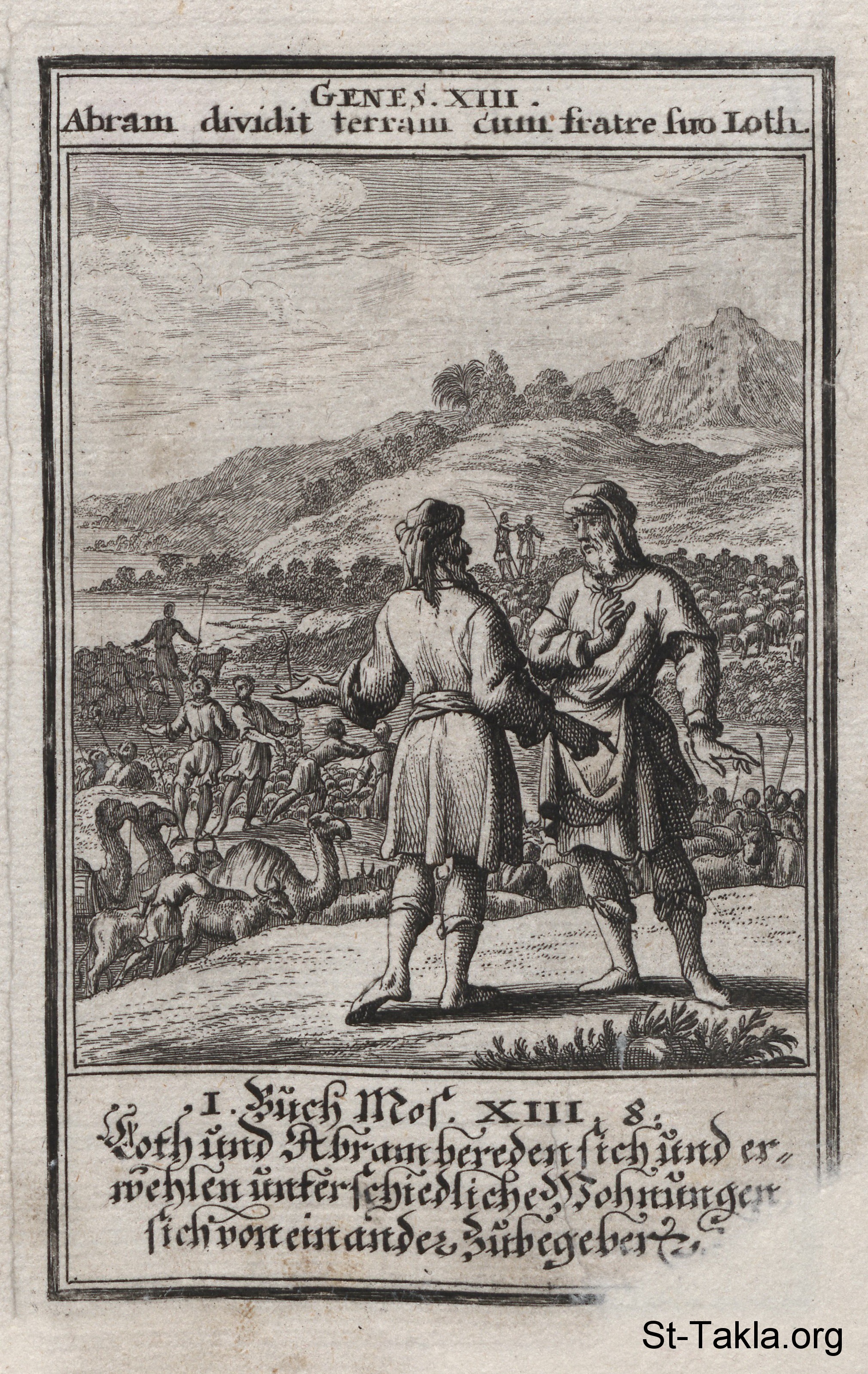 Abram and Lot Separate: Abram stays behind and settles in the land of Canan while Lot goes to the more fertile plains of Jordan: (Genesis 13) - from the book: Biblia Ectypa (Pictorial Bible), by Johann Christoph Weigel, 1695.