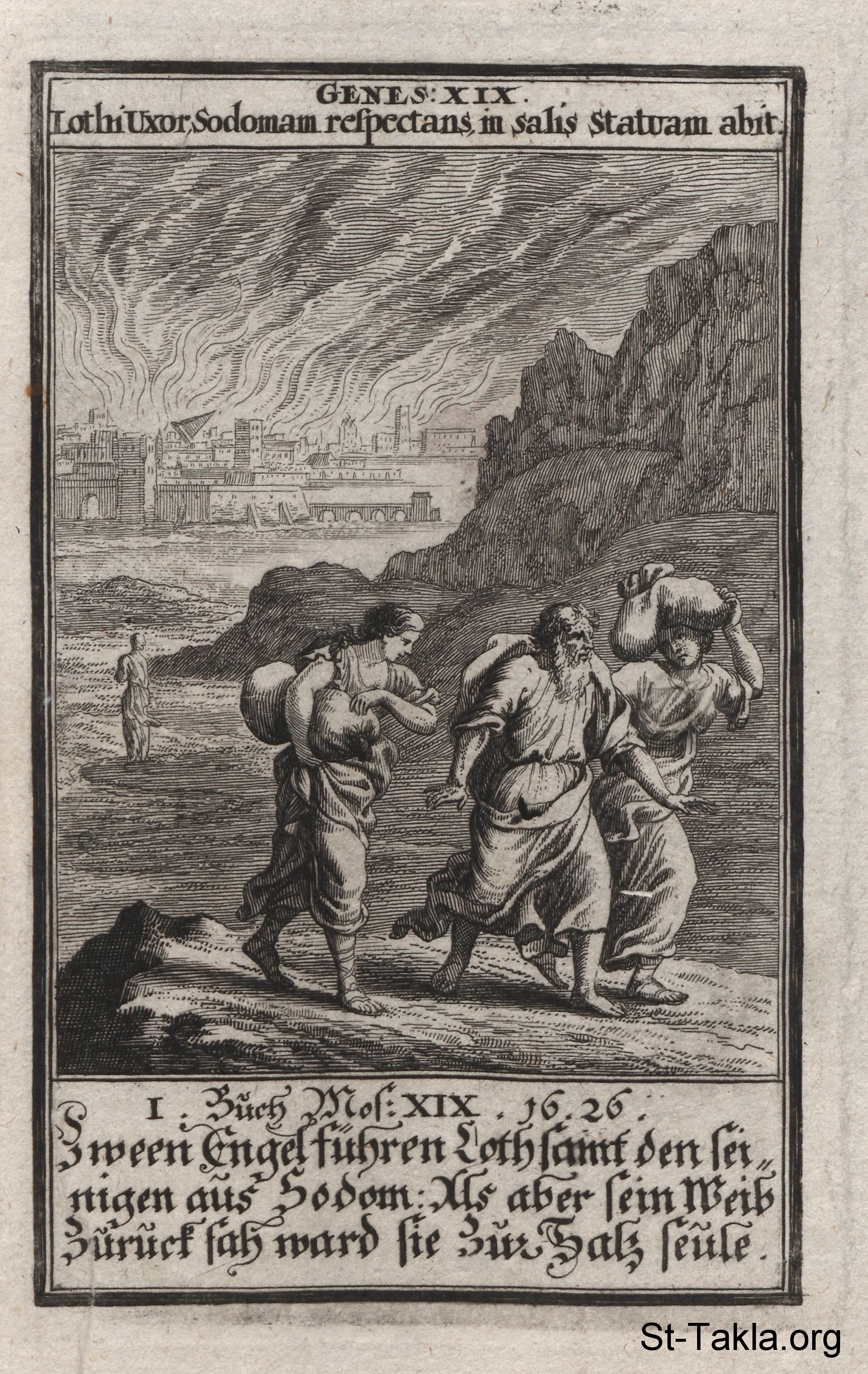 Sodom and Gomorrah: Lot and his two daughters flee from Sodom and Gomorrah as it is being destroyed. Lot’s wife appears as a pillar of salt in the background: (Genesis 19) - from the book: Biblia Ectypa (Pictorial Bible), by Johann Christoph Weigel, 1695.