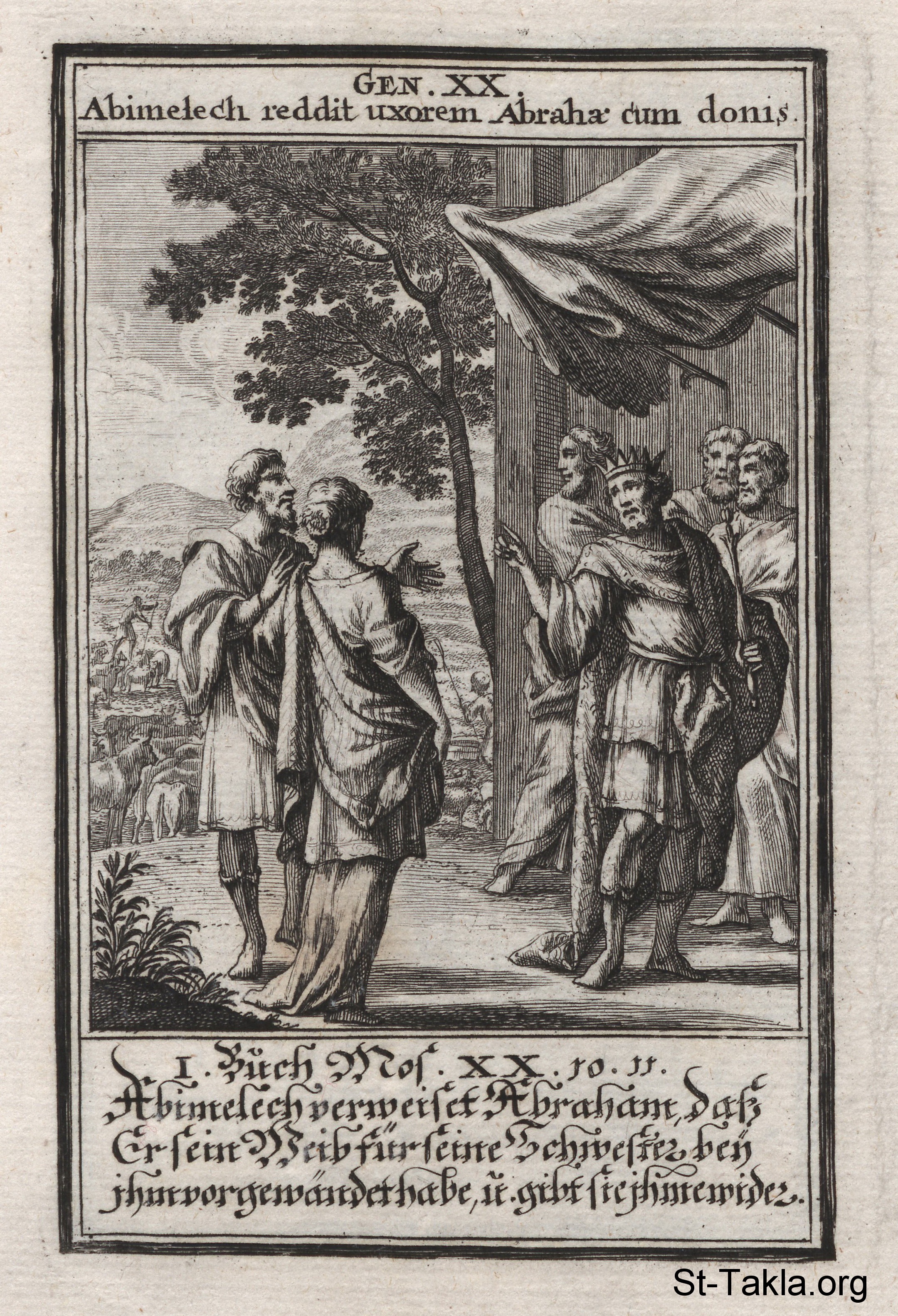 إبراهيم وأبيمالك: أبيمالك يعيد سارة إلى إبراهيم، ويواجهه بعدما اكتشف أن سارة ليست فقط أخته بل زوجته: (التكوين 20) - من كتاب: الكتاب المقدس المصور، يوهان كريستوف فيجيل، 1965 م.