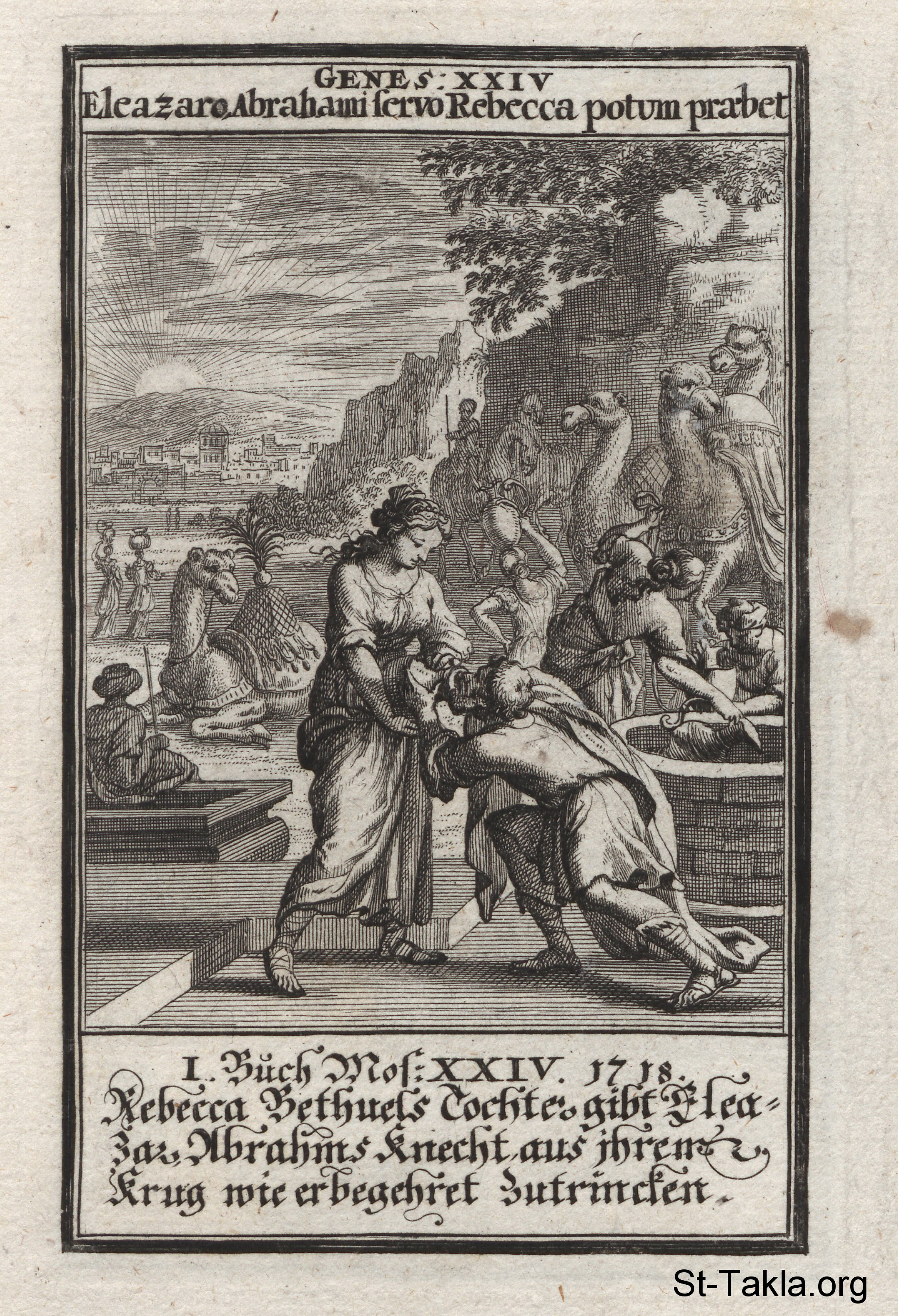 رفقة قرب البئر: رفقة تسقي أليعازر الدمشقي -كبير بيت إبراهيم المستولي- وجماله، كعلامة على أنها زوجة إسحق المخارة من الله: (التكوين 24) - من كتاب: الكتاب المقدس المصور، يوهان كريستوف فيجيل، 1965 م.