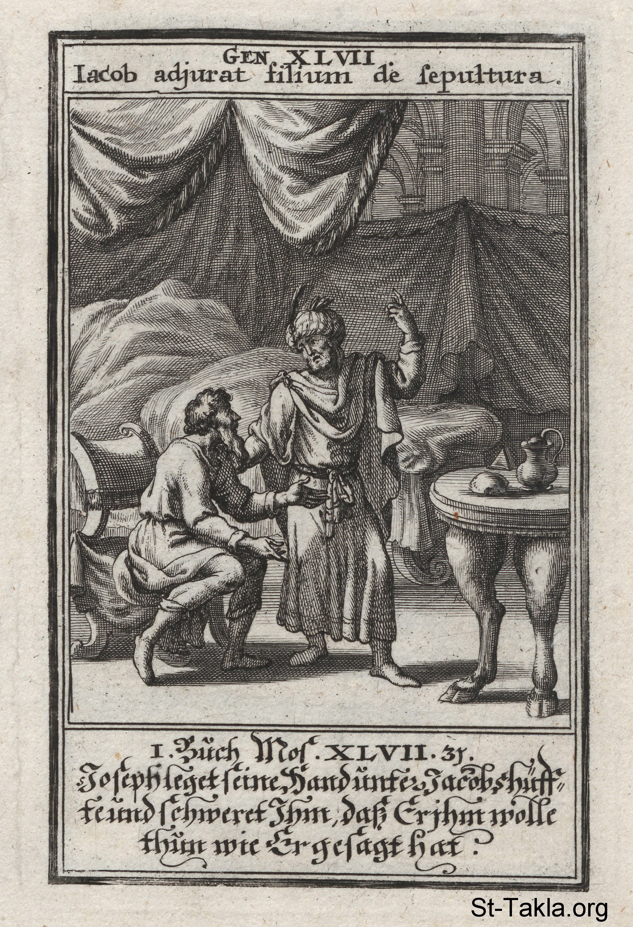 يوسف يعد يعقوب أبيه بأخذ جثمانه إلى كنعان: (التكوين 47) - من كتاب: الكتاب المقدس المصور، يوهان كريستوف فيجيل، 1965 م.