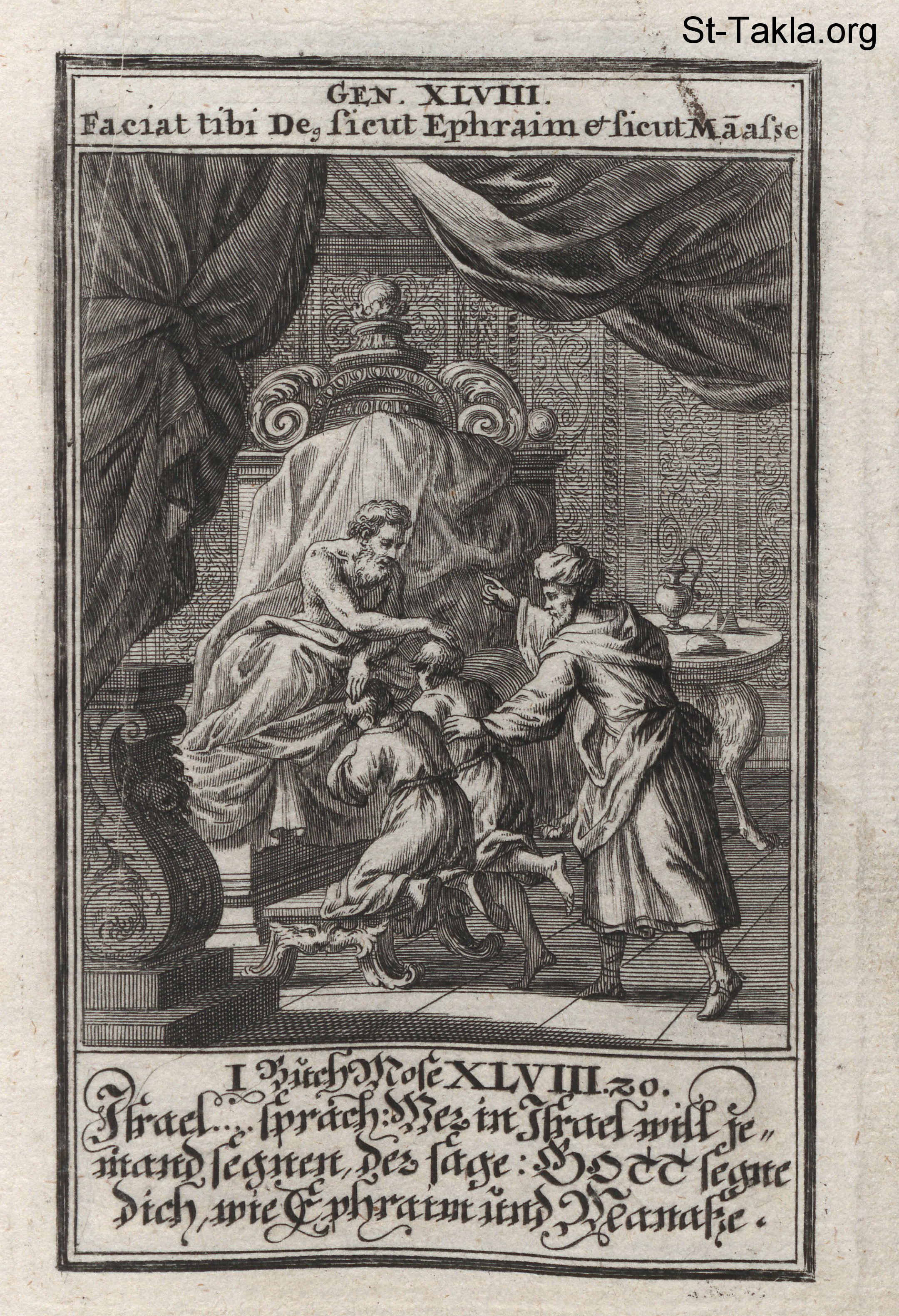 بركة يعقوب لمنسى وأفرايم: يعقوب يعترض بعدما بدأ أبيه بمباركة ابنه الأصغر (أفرايم) قبل الأكبر: (التكوين 48) - من كتاب: الكتاب المقدس المصور، يوهان كريستوف فيجيل، 1965 م.