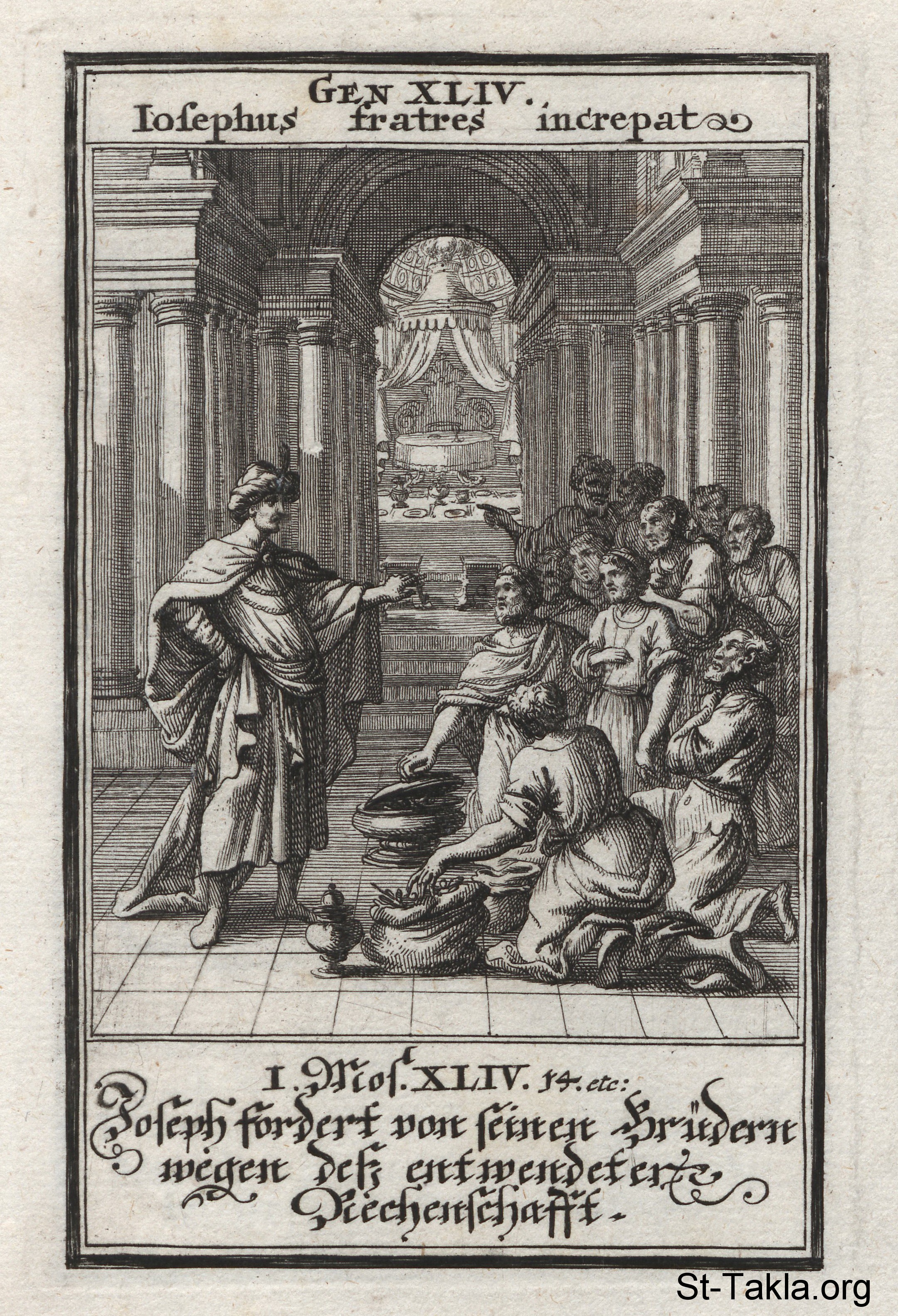 كأس يعقوب الفضي (الطاس): خادم يوسف يجد طاس الفضة الخاص بيوسف في عدال بنيامين، وأخوته يستحلفون ببراءتهم: (التكوين 44) - من كتاب: الكتاب المقدس المصور، يوهان كريستوف فيجيل، 1965 م.