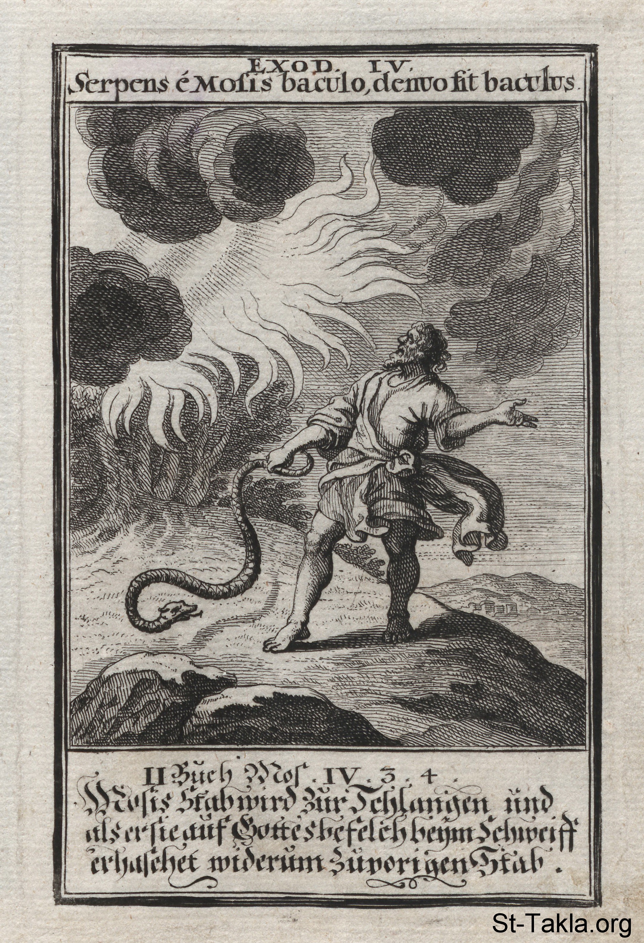 Burning Bush: God gives Moses a sign by turning his staff into a snake at the burning bush: (Exodus 4) - from the book: Biblia Ectypa (Pictorial Bible), by Johann Christoph Weigel, 1695.