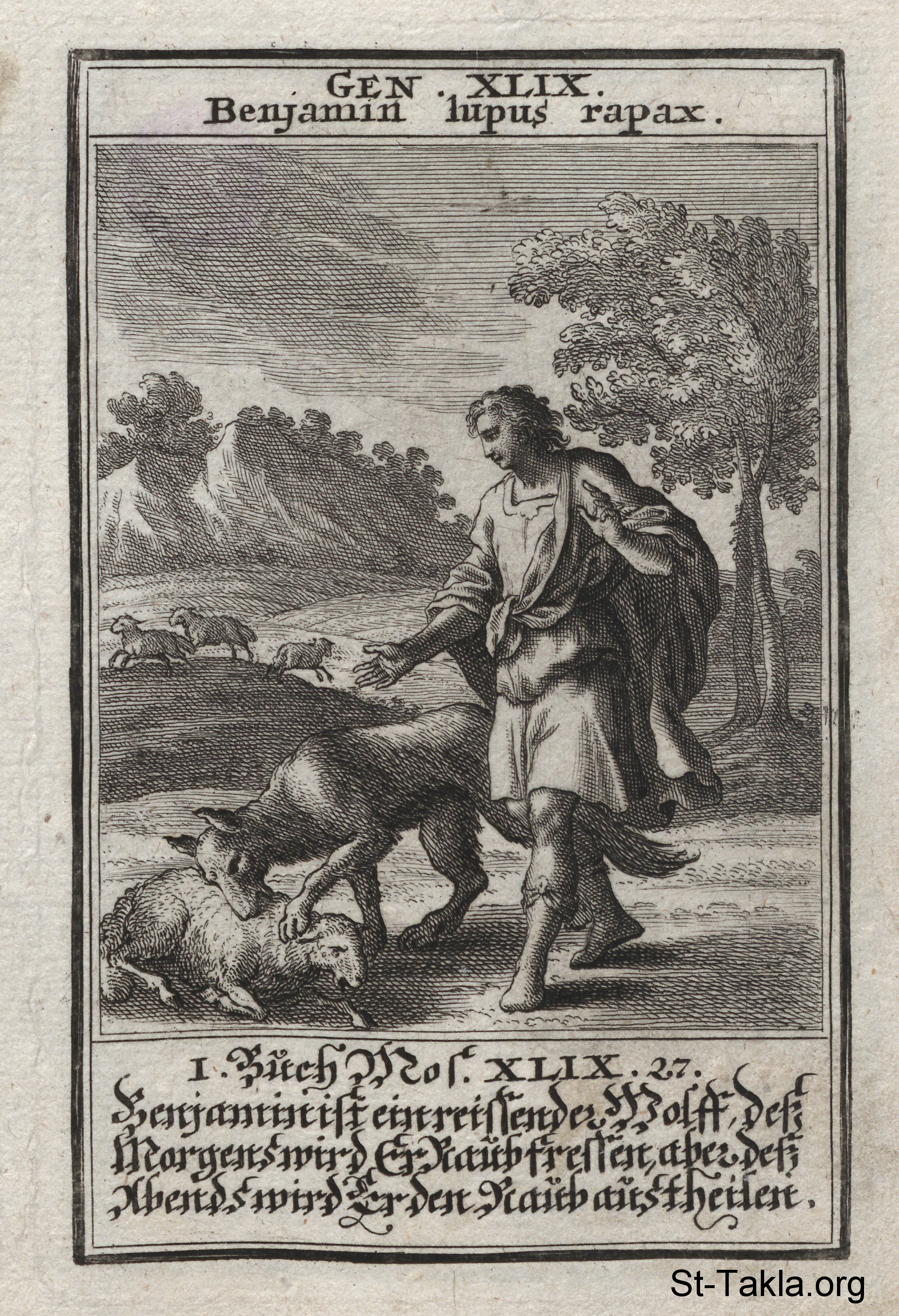 Benjamin: A rendering of Jacob’s blessing of Benjamin: (Genesis 49) - from the book: Biblia Ectypa (Pictorial Bible), by Johann Christoph Weigel, 1695.