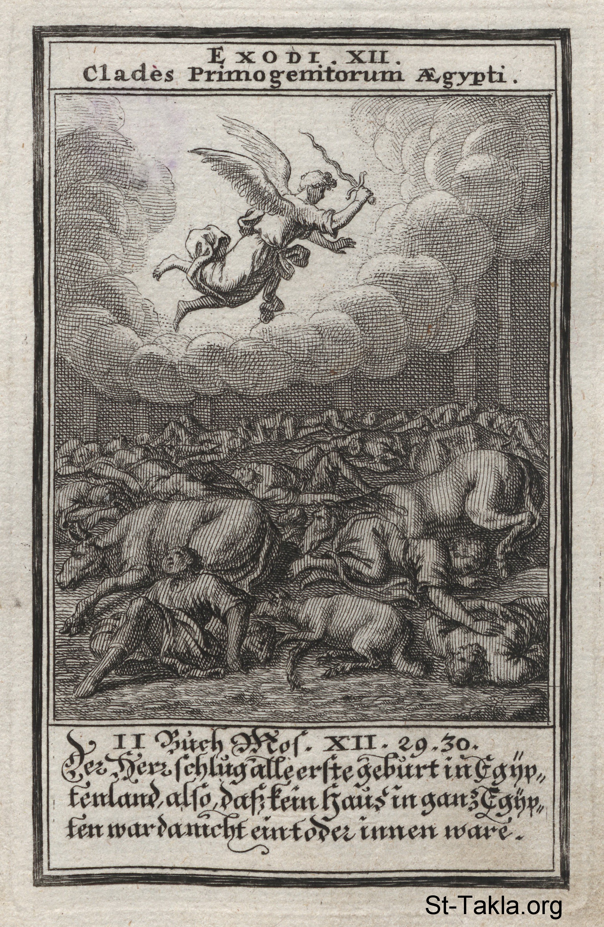 Death of the Firstborn: As a final plague in Egypt, an angel goes throughout the land and kills every firstborn human and animal with a flaming sword: (Exodus 12) - from the book: Biblia Ectypa (Pictorial Bible), by Johann Christoph Weigel, 1695.