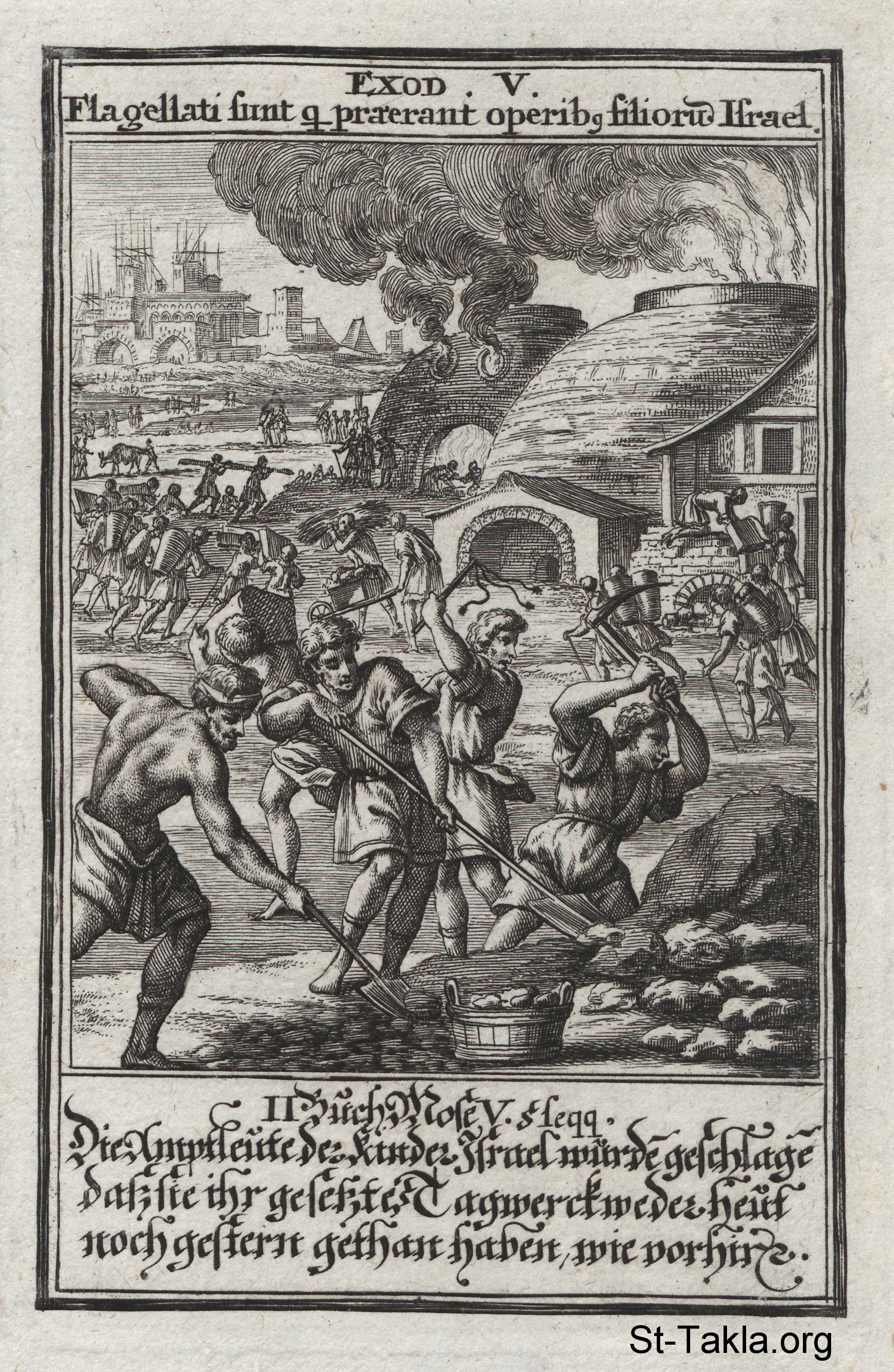 Israel in Egyptian Bondage: While making bricks, Hebrew slaves are beaten and mistreated by Egyptian masters: (Exodus 5) - from the book: Biblia Ectypa (Pictorial Bible), by Johann Christoph Weigel, 1695.