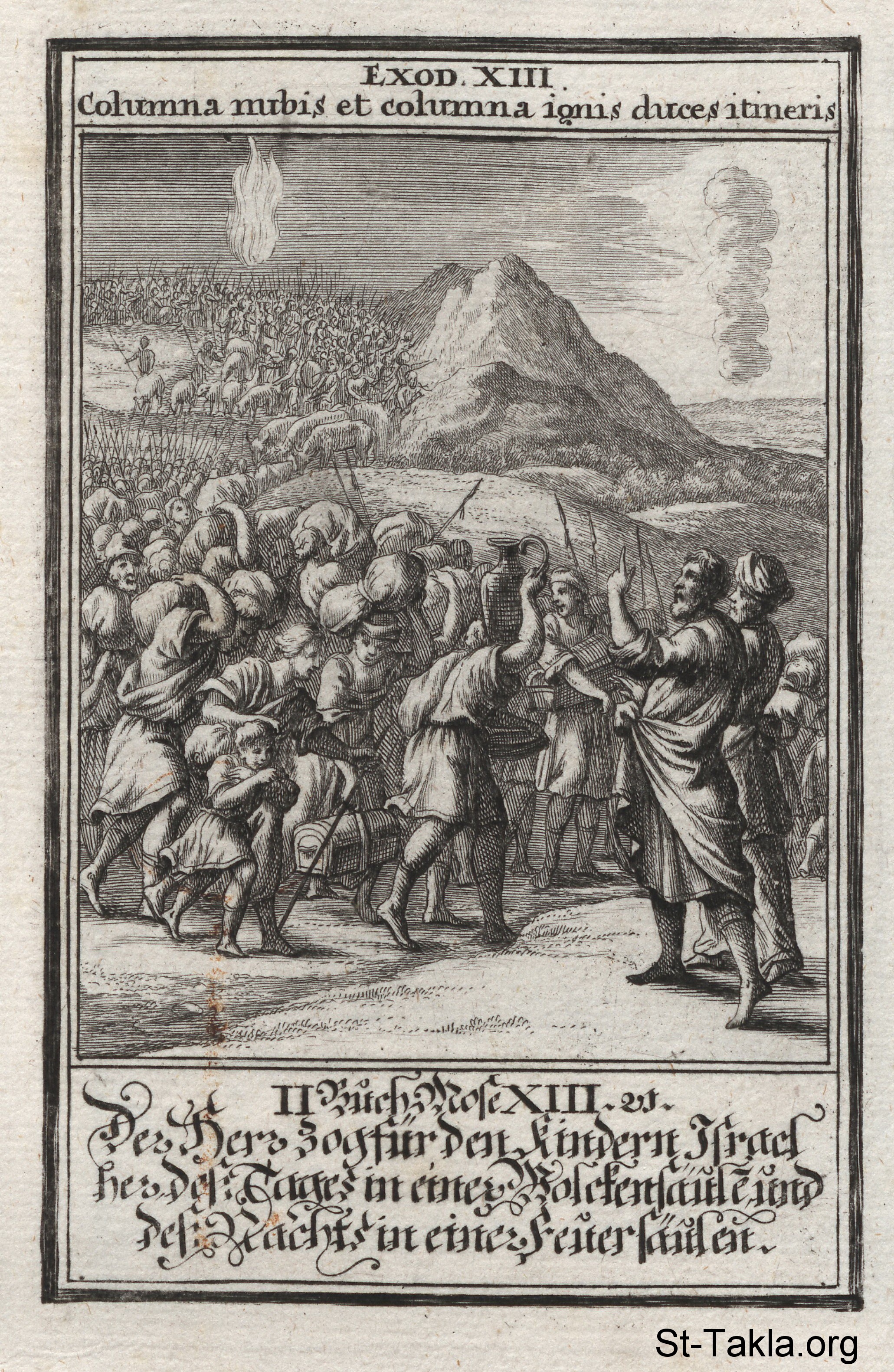 Pillar of Fire and Cloud: A pillar of cloud leads the Hebrews by day and a pillar of fire by night: (Exodus 13) - from the book: Biblia Ectypa (Pictorial Bible), by Johann Christoph Weigel, 1695.