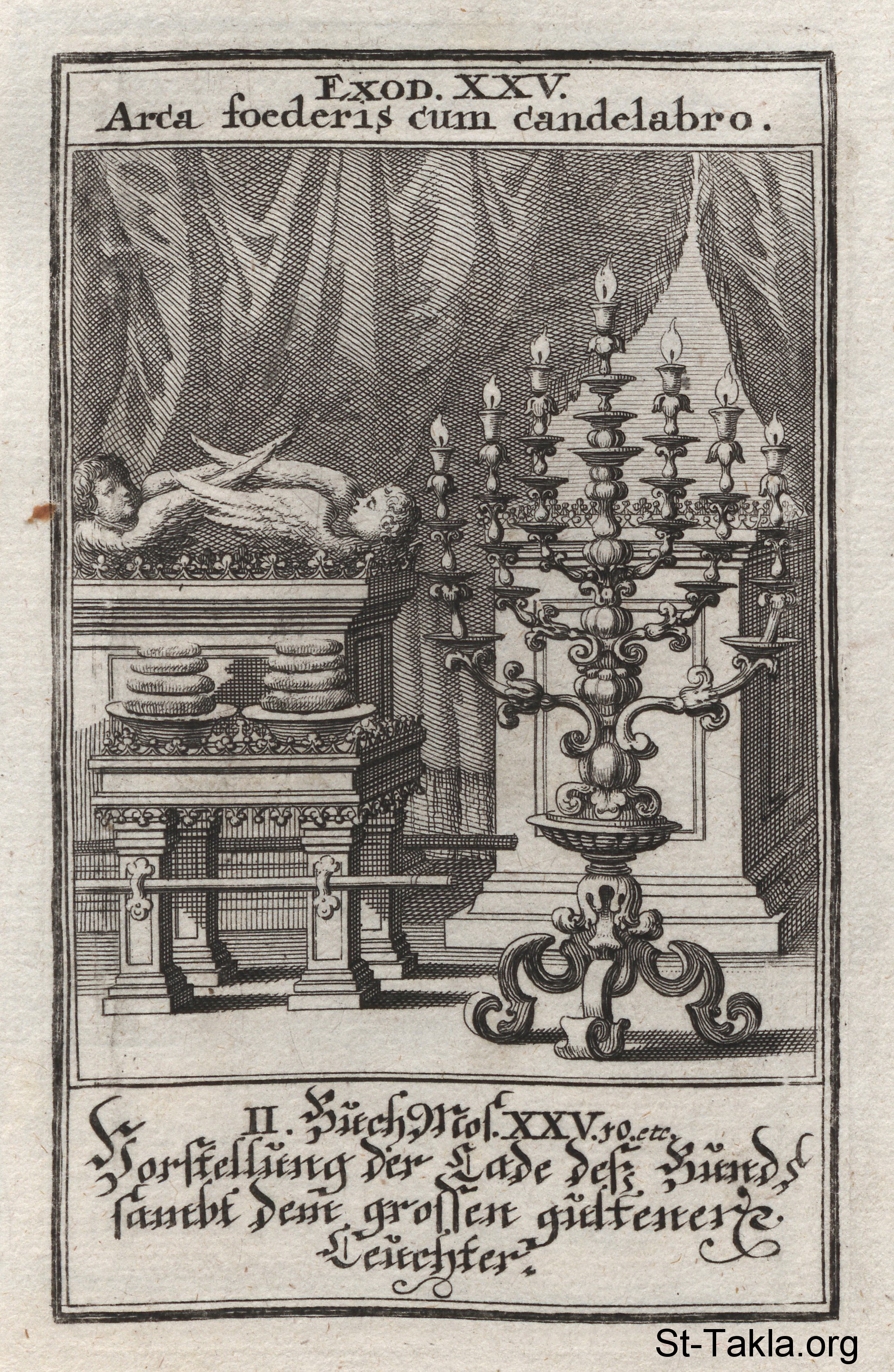 التابوت والمنارة والمائدة ومذبح البخور: تابوت العهد والمائدة التي بها خبز الحضور (خبز الحضرة) والمنارة ومذبح البخور: (الخروج 25) - من كتاب: الكتاب المقدس المصور، يوهان كريستوف فيجيل، 1965 م.