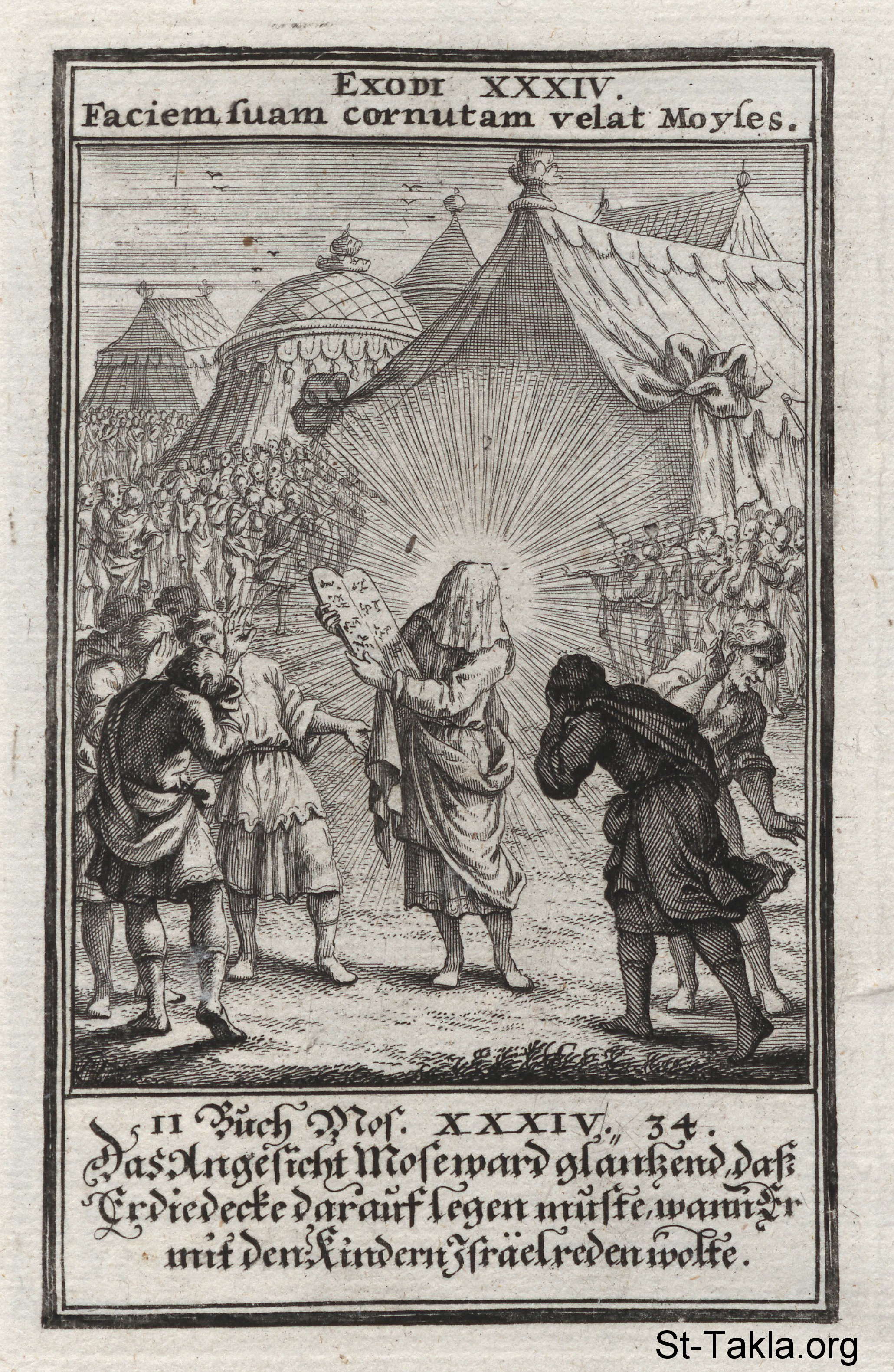 وجه موسى المتألق: يعود موسى بوجه لامع بعد استلام المجموعة الثانية من الألواح التي تحتوي على الوصايا العشر: (الخروج 34) - من كتاب: الكتاب المقدس المصور، يوهان كريستوف فيجيل، 1965 م.