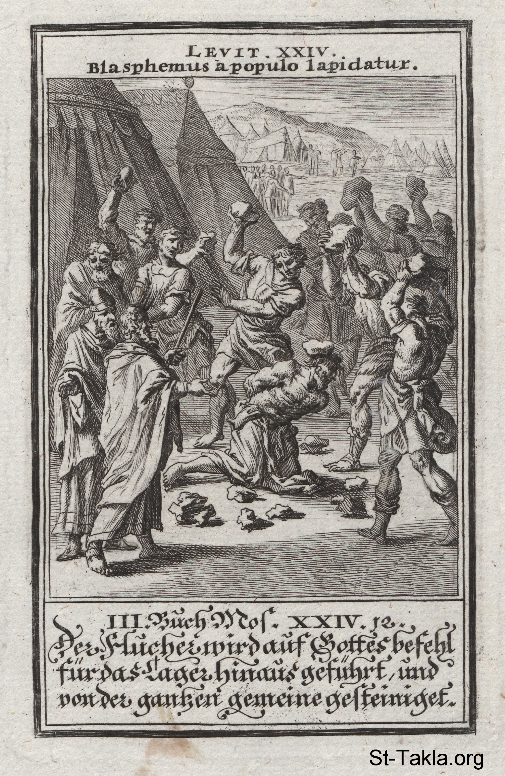 Blasphemer Stoned: The son of Shelomith is stoned for blasphemy as an illustration of the violation of the second commandment: "Thou shalt not take the name of the Lord thy God in vain": (Leviticus 24) - from the book: Biblia Ectypa (Pictorial Bible), by Johann Christoph Weigel, 1695.