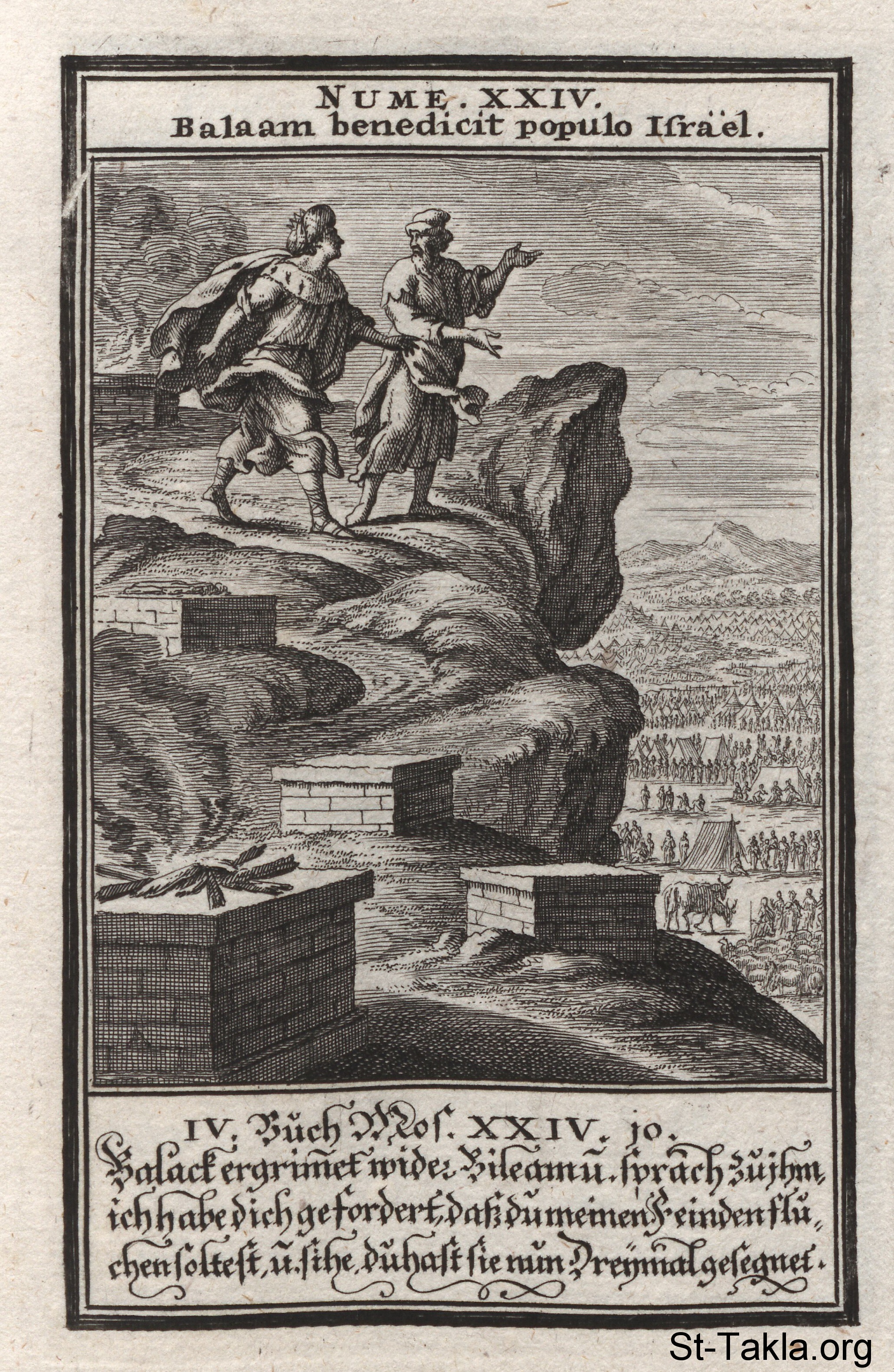 Balak and Balaam: Balak gets angry with Balaam for blessing Israel rather than cursing them: (Numbers 24) - from the book: Biblia Ectypa (Pictorial Bible), by Johann Christoph Weigel, 1695.