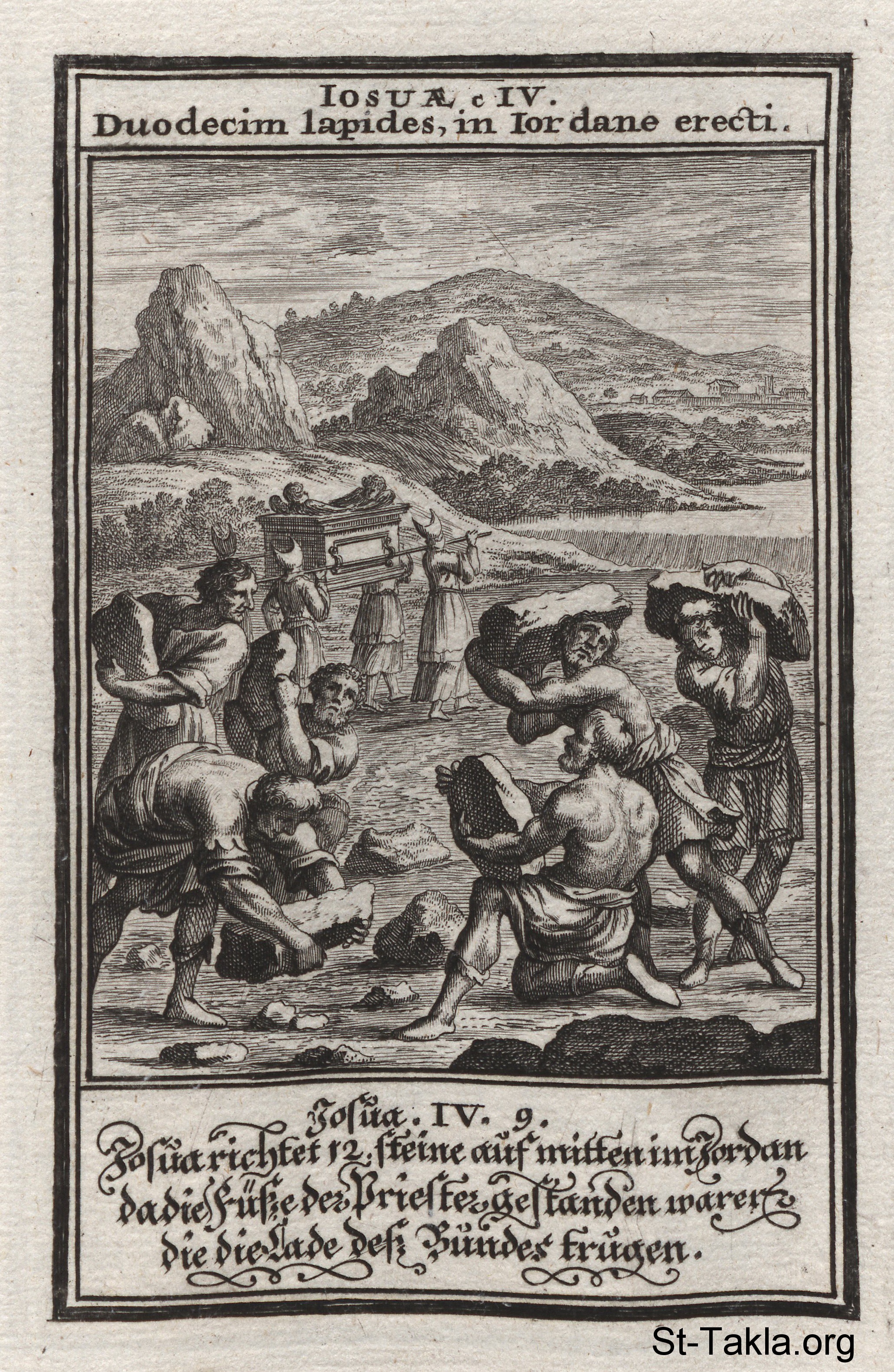 Stones from the Jordan: The Israelites collect twelve stones from the Jordan River, one for each of the twelve tribes of Israel, as the priests hold the Ark of the Covenant in the middle of the river: (Joshua 4) - from the book: Biblia Ectypa (Pictorial Bible), by Johann Christoph Weigel, 1695.