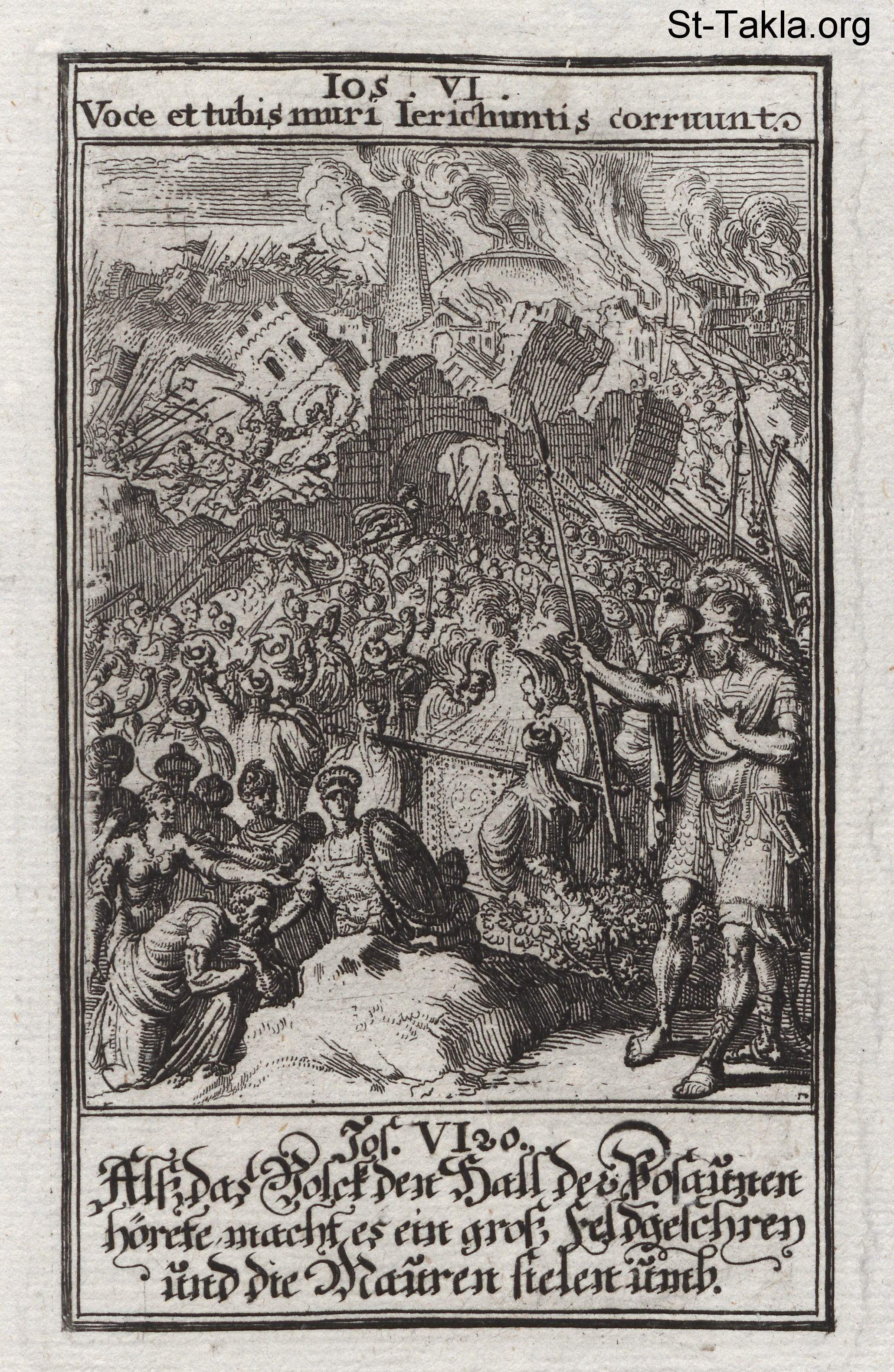 حرب أريحا: سقوط أسوار أريحا بينما يدور الشعب حول المدينة بتابوت العهد، وهم يبوقون بأبواق الهتاف: (يشوع 6) - من كتاب: الكتاب المقدس المصور، يوهان كريستوف فيجيل، 1965 م.