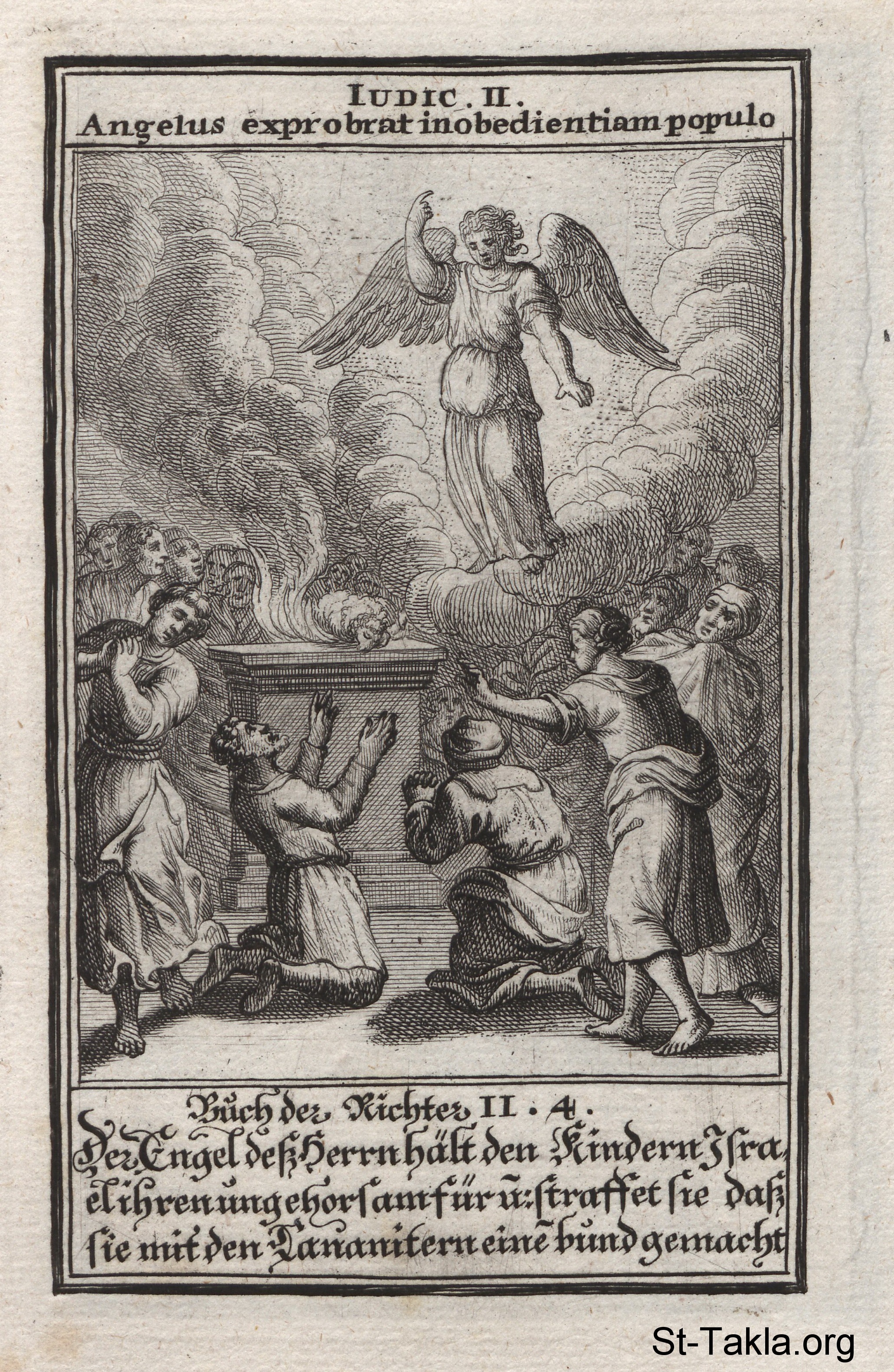 Angel at Bokim: An angel appears at Bokim and condemns the people for not following all the ways of God: (Judges 2) - from the book: Biblia Ectypa (Pictorial Bible), by Johann Christoph Weigel, 1695.